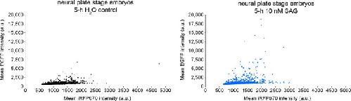 Figure 2—figure supplement 1. Positive control for Gli transcriptional activity reporter.Neural plate stage embryos (18 h post-fertilization) expressing Gli transcriptional activity reporter were incubated in the presence or absence of 10 nM SAG for 5 h followed by live confocal imaging with 488 and 647 nm lasers to acquire the signal corresponding to Gli transcriptional activity (enhanced green fluorescent protein [EGFP]) and expression level for the reporter (iRF670). Individual cells displayed by iRFP670 (x) vs. EGFP (y) fluorescence intensities in control and experimental embryos. Distribution of control vs. SAG EGFP:iRFP670 values significantly different by Kolmogorov–Smirnov test (p<0.0001; N of embryos per condition: 8).Figure 2—figure supplement 1—source data 1. Positive control for Gli transcriptional activity reporter. |