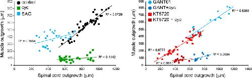 Figure 8 Coordination of spinal cord and muscle outgrowth in the regenerating tail is dependent on Smoothened (Smo) signaling. Individual samples for each treatment are displayed by total outgrowth for spinal cord (X) and muscle (Y). Simple linear regression lines are fit for each treatment, and R2 goodness-of-fit values displayed by each line. N = 13–39 samples per group. |
