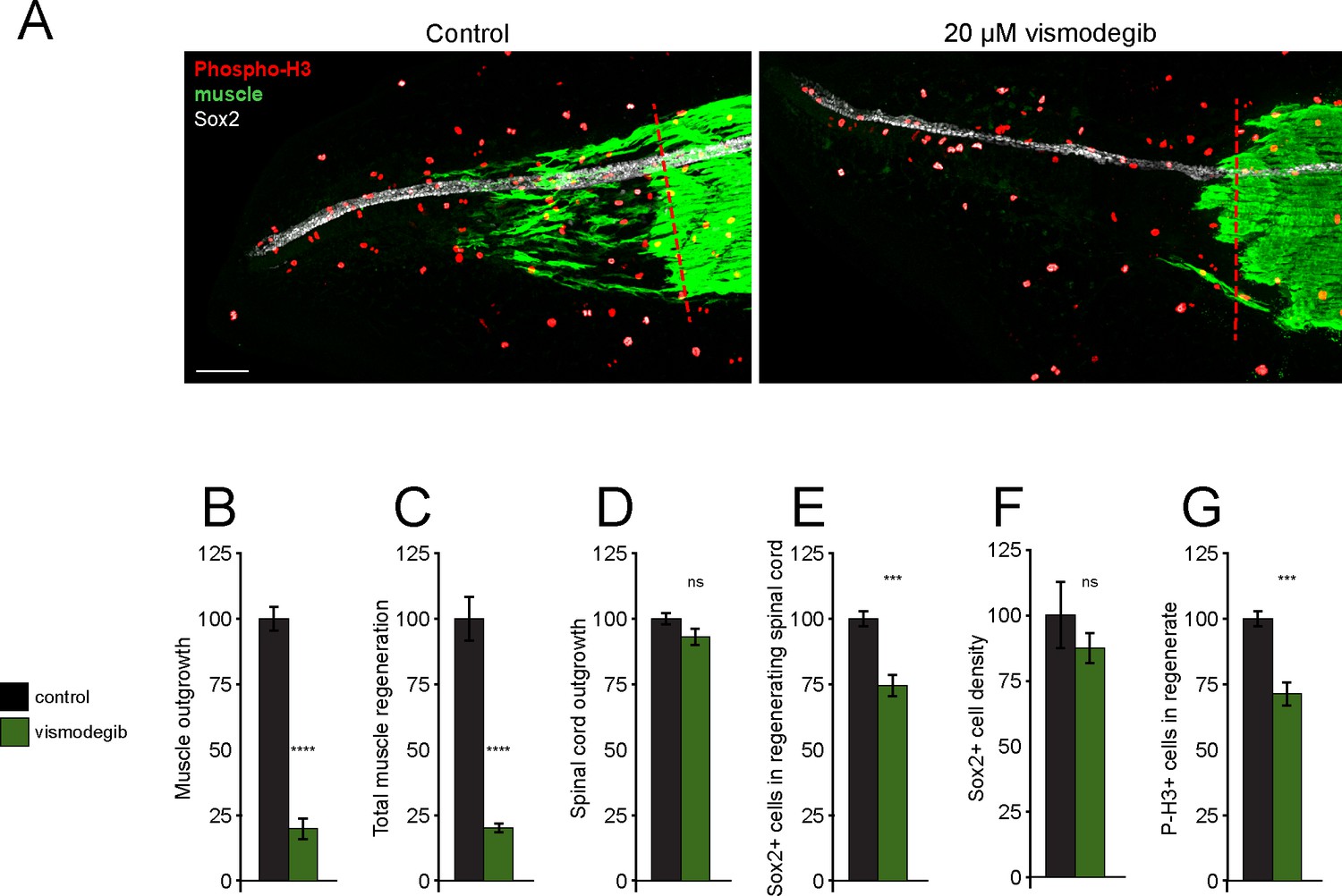 Figure 1—figure supplement 2. Treatment with Smoothened (Smo) antagonist vismodegib reduces muscle and spinal cord regeneration.Stage 39–40 X. laevis larvae were incubated with vehicle (0.1% DMSO, Control) or 20 µM vismodegib for 72 hr, then immunostained. (A) Representative z-projections of whole-mount immunostained samples for both groups at 72 h post amputation (hpa). Transverse red dashed line indicates amputation plane. Scale bar 100 µm. (B–G) Graphs show mean ± SEM regenerated muscle outgrowth (B) and total new muscle volume (C), regenerated spinal cord outgrowth (D), total number (E) and per length density (F) of Sox2+ cells in the regenerated spinal cord, and number of phospho-histone H3+ (P-H3+) cells (G) in the regenerate at 72 hpa as % of cohort-matched control. N of larvae: 8–10 samples per group. ***p<0.001, ****p<0.0001, ns: not significant, two-tailed t-test. |