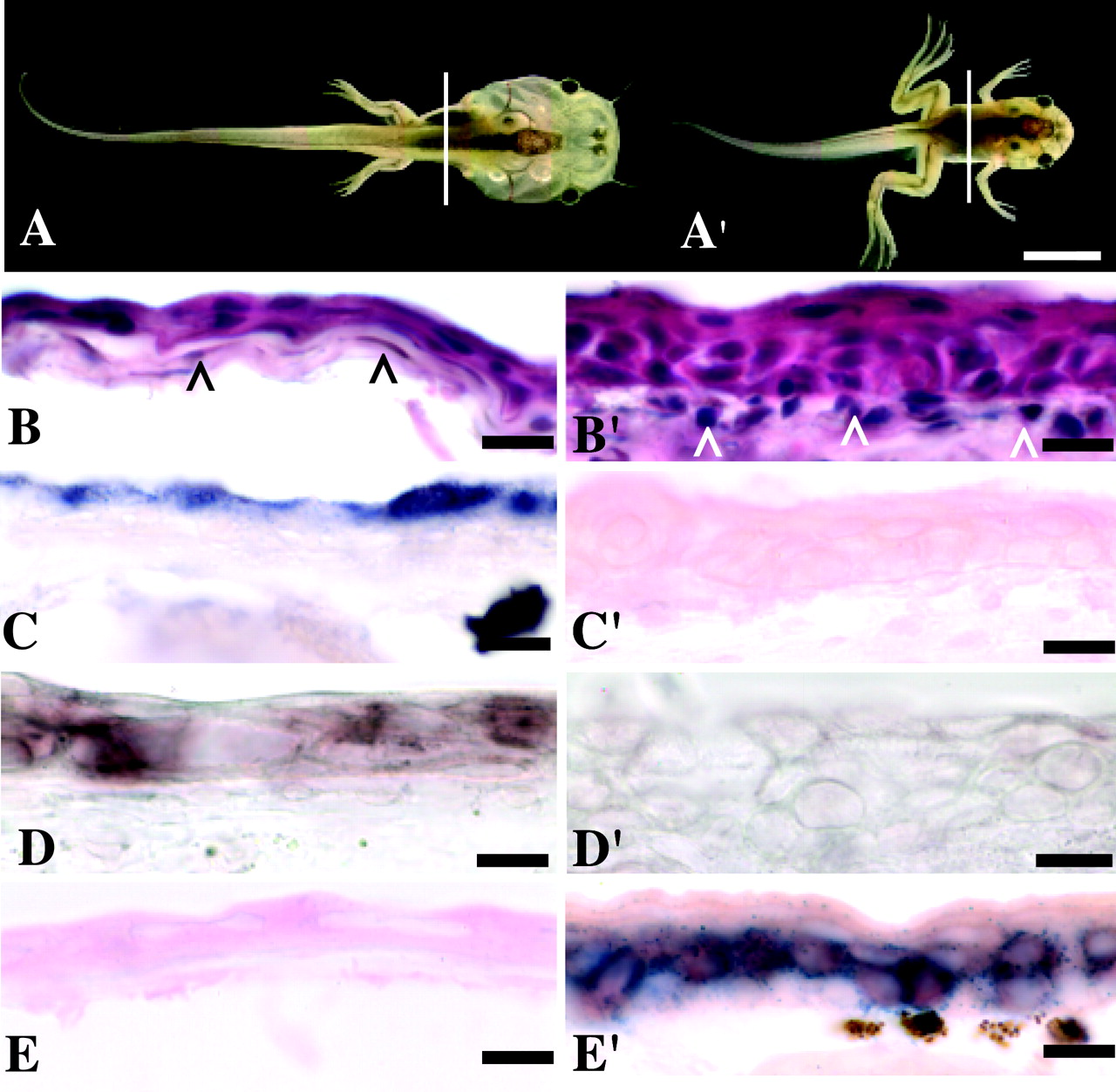 Larval and adult-specific epidermal markers. Tadpoles and cross sections taken from dorsal skin (vertical lines) of premetamorphic stage NF 57 (AâE) and metamorphic climax stage NF 62 (Aâ²âEâ²). Sections were stained with hematoxylin and eosin (B and Bâ²), in situ hybridizations with antisense RNA probes (dark blue/purple) against gene 19 (C and Câ²), larval keratin (D and Dâ²), and adult keratin (E and Eâ²). Eosin stains the epithelial layers bright pink; black arrowheads (B) denote subepithelial fibroblasts, white arrowheads (Bâ²) denote adult dermis. [Scale bars: 500 μM (A and Aâ²) and 5 μM (BâEâ²).]