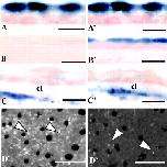 Froglets (NF 64) transgenic for Ker:TRDN retain larval epithelium at the end of metamorphosis. Vertical lines denote regions of skin sectioned from the body and tail of a WT (A) and Ker:TRDN (Aâ²) froglet. (B) Gene 19 expression (dark blue/purple) visualized by in situ hybridization is absent in WT body and tail (F) skin but retained in transgenic body (Bâ²) and tail (Fâ²) skin (black dots are pigment clusters). * denotes adult skin glands. Larval keratin expression in body skin is absent in WT (C) but present in transgenic (Câ²) skin. Adult keratin is expressed in basal cells of both WT (D) and transgenic (Dâ²) skin. Body skin labeled with both gene 19 and adult keratin show the retention of gene 19 expression in transgenic skin (Eâ²), but not in control skin (E). Control (F) and transgenic (Fâ²) tail tips hybridized with gene 19 probe identify retention of larval gene expression in the Ker:TRDN animal. [Scale bars: 500 μM (A and Aâ²), 5 μM (BâEâ²), and 50 μM (F and Fâ²).]
