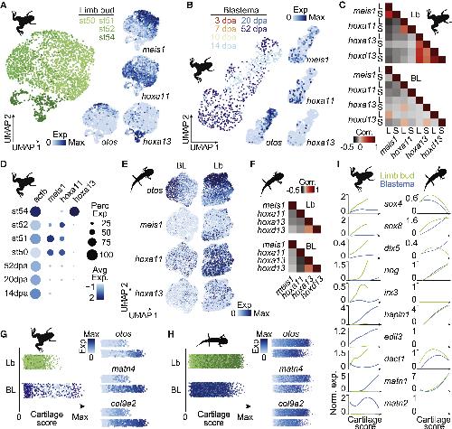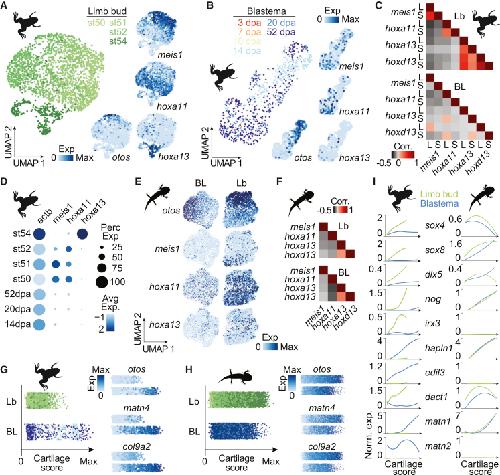 Figure 4. Proximal-distal stratification of patterning factors during cartilage formation in axolotl blastema and tadpole limb buds, but not in froglet blastema(A) UMAP embedding of scRNA-seq data from limb bud cartilage cells ranging from stage 50 to stage 54 limb buds. Cells are colored by limb bud stages. Feature plots (right) show the expression of maturing cartilage marker (otos) and proximal-distal patterning factors (meis1, hoxa11, hoxa13). Cartilage cells were isolated based on the clustering of cells in Figure S4R.(B) UMAP embedding of scRNA-seq data from frog blastema cartilage cells with cartilage cells being isolated based on the clustering of cells in Figure 2A. Cells are colored by blastema time points. Expression of otos, meis1, hoxa11, and hoxa13 are visualized as feature plots.(C) Correlation matrix for proximal-distal patterning genes in the developing cartilage of tadpole limb bud (Lb, top) and frog blastema (BL, bottom).(D) Dot plot showing gene expression intensity and frequency differences between developing cartilage cells in the tadpole limb bud and the frog blastema. Avg Exp: average expression values, Perc Exp: percent of cells expressing each gene. See Figures S4S and S4T for more information.(E) Feature plots showing expression level of otos, meis1, hoxa11 and hoxa13 on UMAP embeddings of scRNA-seq data from the cartilage cells of an 18-dpa axolotl blastema (BL, left) and limb buds (Lb, right). Cartilage cells were isolated based on the clustering of cells in Figure S4U.(F) Correlation matrix for proximal-distal patterning genes in the developing cartilage cells of an 18-dpa axolotl blastema (BL, bottom) and axolotl limb buds (Lb, top).(G) Cartilage scores (x axis) of frog limb bud (Lb, green) and blastema (BL, blue) cells, respectively, based on common markers of cartilage development (left, see STAR methods). Cells are colored by sample with colors matching the ones in (A) and (B) and are jittered along the y axis. Right: Exemplary feature plots of common cartilage development markers.(H) Cartilage scores (x axis) of axolotl limb bud (Lb, green) and blastema (BL, blue) cells, respectively, based on common markers of cartilage development (left, see STAR methods). Cells are colored by sample with colors matching the ones in Figure S4U and are jittered along the y axis. Right: exemplary feature plots of common cartilage development markers.(I) Gene expression as a function of cartilage score for selected genes identified to be differentially expressed between frog limb bud and blastema cartilage differentiation is visualized for frog (left) and axolotl (right) limb bud and blastema cartilage cells. A loess fitted curve through the data points is shown. Green: limb bud. Blue: blastema. |