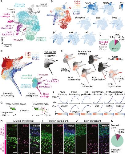 Figure 2. Dermis- and interstitium-derived blastema cells contribute differentially to spike cartilage (A) UMAP embedding of scRNA-seq data of 15,014 cells from a frog blastema time course after data integration using Harmony (Korsunsky et al., 2019). Cells are colored by cluster and cell type annotations are noted. CT cells shown here were extracted from the blastema cell atlases shown in Figures S1A and 1N, or were experimentally enriched by FACS (0 and 3-dpa cells). (B) Left: UMAP embedding as shown in (A) with cells being colored by sampling time point. Right and Bottom: feature plots visualizing the expression of cluster marker genes. (C) Pie chart showing fractions of cell types composing the CT in the mature uninjured state (0 dpa). (D) Spring plot (Weinreb et al., 2018) of Harmony-integrated scRNA-seq data of 13,124 CT cells excluding skeletal and dermal cells. Left: cells colored by time point. Center: cells are colored by cluster with cell types being noted. Right: cells colored by ranked pseudotime estimates obtained from a diffusion map analysis (Angerer et al., 2016). (E) GO enrichment scores identified based on genes differentially expressed along the pseudotime course. Scores are visualized as feature on the SPRING embedding. Innate immune response (GO:0045087), extracellular matrix (ECM) disassembly (GO:0022617), Positive regulation of cell proliferation (GO:0008284), Intermediate filament (GO:0005882), ECM organization (GO:0030198). (F) Top: GO enrichment scores are visualized as a function of pseudotime by a loess fitted curve through the data points. Bottom: expression intensities of example genes for each GO term are shown. (G) Schematic illustration of tissue transplantation assays. See Figure S2 for details. Red box indicates the regions shown in (HâJ). (HâJ) Magnified insets from representative longitudinal sections of muscle (H) (n = 2), tendon (I) (n = 2), and skin (J) (n = 2) transplantation samples. Sections were immunostained for GFP (donor tissue, green), Sox9 (chondrocytes, magenta), and the merged image with DAPI (nuclei, blue). The field of view was further divided into spike dermis (upper region, purple) and spike cartilage (lower region, magenta) according to the expression of Sox9. Scale bars represent 20 μm. (K) Pie chart showing percentage contributions of interstitial cells, tendon cells and dermal cells to Sox9-expressing cartilage in the spike |