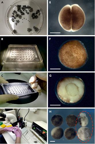 Figure 1. The main steps of embryo preparation(A) Fertilized eggs before cleavage begins.(B) Embryos in Terasaki plates before manipulation.(C)Capillary preparation for microinjection.(D) Microinjection in embryos: general view of the workspace.(E) Two-cell stage embryo.(F) Embryo at the gastrula stage (stage 12), top (animal) view.(G) Embryo at the gastrula stage (stage 12), bottom (vegetal) view.(H) Alive (four on the left) and dead (two on the right, indicated by a red dashed line) embryos.Scale bars are 500 μm.