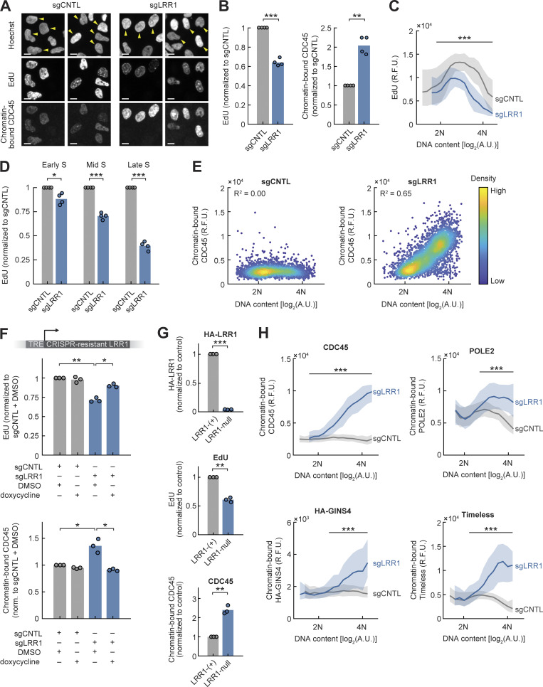 Figure 2. LRR1 knockout results in failure to disassemble replisomes and reduced rate of DNA replication.(A) Continuously cycling Cas9 cells were transfected with sgRNAs and fixed 1 d later, as in B–F and H. Sample immunofluorescence images are shown. Arrowheads indicate S-phase cells. Scale bar: 10 µm. Data are representative of four independent experiments. (B) Left: Rate of EdU incorporation in S-phase cells normalized to control cells (sgCNTL). Paired Student’s t test; P = 5.5 × 10−4 (n = 4 independent experiments, n ≥ 4,272 cells per condition). Right: Abundance of chromatin-bound CDC45 in S-phase cells normalized to control cells. Paired Student’s t test; P = 1.1 × 10−3 (n = 4 independent experiments, n ≥ 4,272 cells per condition). (C) Rate of EdU incorporation in S-phase cells is plotted as a function of DNA content. Line plots are population medians in each bin; shaded error bars indicate 25th to 75th percentile (n ≥ 61 cells per bin, n = 9,393 and 6,182 cells total). Two-sample Student’s t test; ***, P < 1 × 10−3. Data are representative of four independent experiments. (D) Rate of EdU incorporation in early, mid, and late S-phase cells normalized to control cells. Early S: 2N–2.2N DNA, mid S: 2.9N–3.1N DNA, late S: 3.8N–4N DNA. Paired Student’s t test; P = 0.030, 6.2 × 10−4, 3.5 × 10−4 (n = 4 independent experiments, n ≥ 124 cells per condition). (E) Scatter plot of abundance of chromatin-bound CDC45 against DNA content in S-phase cells (R2 = 0.00 and 0.65; P = 0.98, P < 1 × 10−3; n = 3,000 random cells displayed). Data are representative of four independent experiments. (F) Top: Rate of EdU incorporation in S-phase cells normalized to control cells (sgCNTL + DMSO). Paired Student’s t test; P = 4.4 × 10−3, 0.015 (n = 3 independent experiments, n ≥ 4,993 cells per condition). Bottom: Abundance of chromatin-bound CDC45 in S-phase cells normalized to control cells. Paired Student’s t test; P = 0.031, 0.028 (n = 3 independent experiments, n ≥ 4,993 cells per condition). TRE, tetracycline-responsive element. (G) LRR1 was depleted in LRR1−/− cells expressing exogenous, doxycycline-inducible LRR1 by removing doxycycline and transfecting siRNA targeting exogenous LRR1. As a negative control, the same cell line was treated with doxycycline and nontargeting siRNA. Nuclear fluorescence signals were normalized to control cells (LRR1 positive). Paired Student’s t test; P = 5.9 × 10−4, 5.3 × 10−3, 3.5 × 10−3 (n = 3 independent experiments, n ≥ 1,041 cells per condition). (H) Abundance of chromatin-bound replisome components in S-phase cells is plotted as a function of DNA content. Line plots are population medians in each bin; shaded error bars indicate 25th to 75th percentile. Two-sample Student’s t test; ***, P < 1 × 10−3. CDC45: n ≥ 61 cells per bin, n ≥ 6,182 cells total. HA-GINS4: n ≥ 51 cells per bin, n ≥ 7,224 cells total. POLE2: n ≥ 71 cells per bin, n ≥ 4,647 cells total. Timeless: n ≥ 50 cells per bin, n ≥ 4,383 cells total. Data are representative of at least two independent experiments (HA-GINS4: two technical replicates). A.U., arbitrary unit; norm., normalized; R.F.U., relative fluorescence unit. In all panels, *, P < 0.05; **, P < 0.01; ***, P < 0.001. |