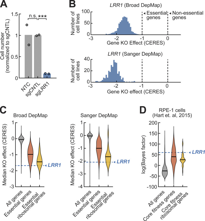Figure 5. LRR1 is an essential gene in normal and cancerous human cells.(A) Cell number after 7 d of culture normalized to control cells (sgCNTL). Two-sample Student’s t test; n.s., P = 0.97; ***, P = 1.5 × 10−4 (n = 2 technical replicates). NTC, non-treated control, where cells were not transfected with sgRNAs. (B) Histogram of LRR1 knockout (KO) effect (CERES score) in a panel of cancer cell lines from Broad and Sanger DepMap projects (n = 769 and 317 cell lines, DepMap Public 20Q2 release). A larger negative gene KO effect indicates that a gene is more likely to be essential in a given cell line. (C) Violin plot of median KO effect (across all cell lines) for all genes, essential genes, and essential ribosomal genes from Broad and Sanger DepMap projects. Dashed lines indicate median KO effect for LRR1. List of ribosomal genes is obtained from the HUGO Gene Nomenclature Committee. (D) Violin plot of Bayes factor for all genes, core fitness genes, and core fitness ribosomal genes in RPE-1 cells (Hart et al., 2015). Dashed line indicates Bayes factor for LRR1. A larger Bayes factor indicates that a gene is more likely to be essential. |