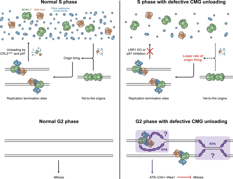 Figure 6. Working model. Recycling of replisome components back into the soluble pool after replication termination is blocked when CMG unloading and replisome disassembly are defective. This leads to lower rates of origin firing at yet-to-fire origins and reduced rate of DNA replication globally. Persistent binding of post-termination replisomes to chromatin during G2 results in accumulation of single-stranded DNA and activation of the ATR–Chk1–Wee1 pathway, which triggers the G2/M checkpoint and blocks entry into mitosis. The mechanism and exact DNA structures that generate single-stranded DNA and RPA binding require further study. KO, knockout; Pol, polymerase. |