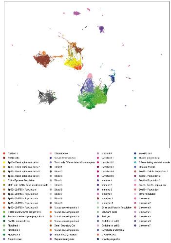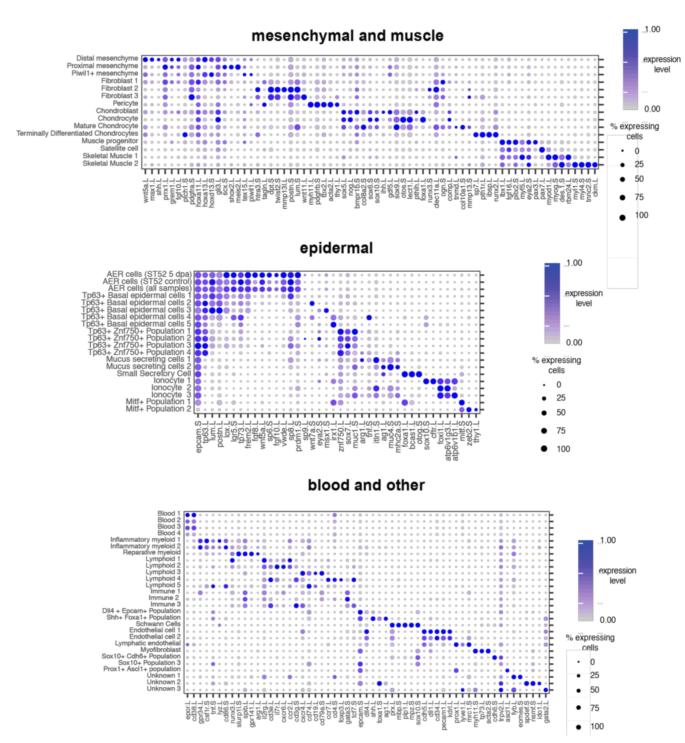Figure S5: Annotation of cell types using known markers of cell identity. Dotplots showing marker genes for each of the 61 cell types in our atlas. For ease of presentation, we group cell types into three broad categories: mesenchymal and muscle (top), epidermal (middle), blood and other (bottom). Please note that for the AER cell cluster, we also provide marker gene expression for specific samples as indicated. Dot color denotes mean expression level within the cluster; dot size denotes the percentage of cells within the cluster with non-zero expression. |