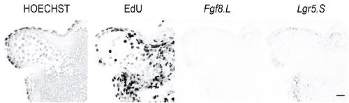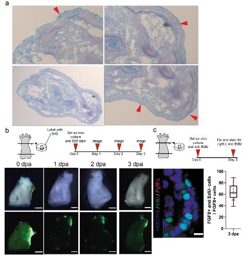 Figure S13: AER cells formation does not require cell division. (a) 3 dpa regeneration-competent explants are covered with cells morphologically similar to the surrounding basal epidermal cells as evidenced by haematoxylin, eosin, and Alcian blue stain. There are multi-layered or monolayered epidermal cells with cuboidal shape that can be seen not only at the distal site (right-bottom) but also at the lateral sides as well (right-top). A squamous layer can be seen above the basal epidermal cells. (b) (Top) Schematic describing DiO based tissue tracing. DiO labelling was performed after ex vivo cultures were harvested. Explants were imaged every day until day 3 in culture via stereomicroscope. (Bottom) DiO tracing applied to the sides of explants and traced over time and images were taken in brightfield and green channel. Traced tissues migrated to the distal and proximal amputation planes of explants. Total n = 22 from 2 biological replicates. Scale = 200 μm. (c) (Top)Schematics describing ex vivo culture with EdU treatment. EdU was added to explant media at the beginning of the culture. (Bottom-left) Explants were fixed and stained via HCR for Fgf8.L, and EdU after day 3 in culture. (Bottom-middle) Example confocal image of a sectioned sample stained via HCR for Fgf8.L, Lgr5.S, and EdU, showing that not all Fgf8.L+/Lgr5.S+ cells are EdU+. Hoechst, Blue; EdU, Green, Fgf8.L mRNA, Magenta. Scale = 10 μm. (Bottom- Right) Quantification of EdU positive AER cells proportion to all detected AER cells. Approximately 60% of AER cells are EdU negative. Total n= 15 from 3 biological replicates. |