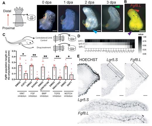 Fig. 3. Ex vivo regenerating limbs demonstrate that AER cell formation requires activation of multiple pathways and can form from basal epidermal cells. (A) Left: schematic for ex vivo regeneration limb culture. Right: time-lapse images of a regeneration-competent explant. The explant grows a cone shape at its distal site reminiscent of in vivo regeneration (green arrowhead), while the proximal site shows chondrogenesis (blue arrowhead). Scale bars: 200â μm. (B) An example image of a regeneration-competent explant at 3â days post-culture. The distal site of explants is Fgf8.L positive (red arrowhead); the proximal site is Fgf8.L negative (purple arrowhead). Red, Fgf8.L mRNA. Scale bar: 200â μm. (C) Drug screen to test regulators of AER cell formation. Top: schematics describing the screen. One limb of a tadpole was used for perturbation and the contralateral limb from the same tadpole was used as a control. Samples were treated with the indicated drugs for 3â days post-culture, and then stained for Fgf8.L mRNA. Bottom: the extent of Fgf8.L expression along the amputation plane was measured. Sample sizes: ICRT3 total, nâ¥9 from three biological replicates; SU5402 total, nâ¥9 from two biological replicates; LDN193189 total, n=8 from three biological replicates; SB431542 total, n=8 from two biological replicates; DAPT total, n=7 from three biological replicates. *P<0.05, **P<0.001. Data are mean±s.e.m. (D) Factor analysis identifies a putative gene expression trajectory from basal epidermal cells to AER cells, predicting sequential activation of Lgr5.S followed by Fgf8.L. (E) A proximal-to-distal gradient of Lgr5.S and Fgf8.L is observed in vivo, with Fgf8.L being restricted to the most distal regions of the midline epidermis. Black dots represent HCR mRNA signal. Scale bars: 20â μm. |