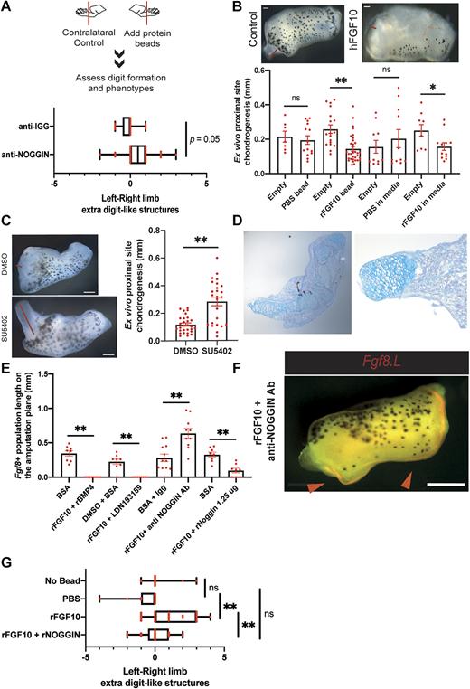 Fig. 5. FGF10 impacts chondrogenesis and operates upstream of NOGGIN. (A) Anti-NOGGIN antibody application to distal amputations improves regeneration in regeneration-restricted and -incompetent tadpoles. Regeneration-restricted and -incompetent tadpole right and left hindlimbs were amputated, and beads containing anti-IGG antibody or anti-NOGGIN antibody were placed on the right hindlimbs. Formed digits and digit-like structures were quantified in the right and left hindlimbs, and the difference calculated. Anti-IGG antibody total, n=17 from three biological replicates; anti-NOGGIN antibody total, n=28 from four biological replicates. (B) The effect of FGF10 on chondrogenesis is assessed by measuring the chondrogenic outgrowth at the proximal sites of regeneration-restricted explants at 3â dpa. Red lines show measured proximal chondrogenesis. Implanting 0.1% BSA/PBS beads at the proximal site or supplying 0.1% BSA/PBS to the media had no significant effect on chondrogenesis, while implanting Fgf10 beads at the proximal site or supplying FGF10 in media reduced chondrogenesis. Contralateral limbs were used as controls and are labelled as empty. From left to right, empty and PBS beads total, nâ¥7 from at least two biological replicates; empty and FGF10 bead total, nâ¥14 from at least four biological replicates; empty and 0.1% BSA/PBS in media total, n=10 from three biological replicates; empty and FGF10 in media, nâ¥14 from at least three biological replicates. ns, not significant; *P<0.05 and **P<0.001. Data are mean±s.e.m. Scale bar: 50â µm. (C) Left: example images of SU5402-treated explants showing extensive chondrogenesis at the proximal site. Red lines show measured proximal chondrogenesis. Right: blocking FGFR via the small molecule inhibitor SU5402 extends chondrogenesis in 3â days for regeneration-competent and -restricted explants. Contralateral limbs were used as controls and treated with DMSO. DMSO total, n=29 from seven biological replicates; SU5402 total, n=25 from seen biological replicates. **P<0.001. Data are mean±s.e.m. Scale bar: 200â µm. (D) Representative sectioned histology images for 3â dpa explants treated with SU5402. The outgrowing structures are Alcian Blue rich, which is indicative of chondrogenic cells. (E) Regeneration-competent explants were treated with a combination of FGF10 and recombinant BMP4, or with recombinant NOGGIN, with LDN193189 or with anti-NOGGIN antibody. 0.1% BSA/PBS and anti-IGG antibody were used as controls. From left to right: BSA total, n=8 from two biological replicates; recombinant FGF10 and recombinant BMP4 total, n=8 from two biological replicates; DMSO and BSA total, n=8 from two biological replicates; FGF10 and LDN total, n=8 from two biological replicates; BSA and anti-IGG antibody total, n=12 from three biological replicates; FGF10 and anti-NOGGIN antibody total, n=10 from three biological replicates; BSA total, n=8 from two biological replicates; recombinant FGF10 and recombinant NOGGIN total, n=8 from two biological replicates. **P<0.001. Data are mean±s.e.m. (F) Representative whole-mount stereomicroscope image of rFGF10 and anti-NOGGIN antibody treated explants can show a substantial Fgf8.L expression at different sites of the explant (n=5/9 from two biological replicates, compared with n=0/121 in controls, P<0.0001). Scale bar: 200â μm. (G) Recombinant FGF10 application to distal amputations restore regeneration in -regeneration-restricted and -incompetent tadpoles. Regeneration-restricted and -incompetent tadpole right and left hindlimbs were amputated, and beads containing 0.1% BSA/PBS or recombinant FGF10 or recombinant FGF10 and NOGGIN were placed on the right hindlimbs. Formed digits and digit-like structures were quantified in the right and left hindlimbs and the difference calculated. Box and whisker plots show minimum to maximum for all data points. Red dots represent individual data points. Where applicable, boxes show interquartile range (25-75%). Mean for No bead: 0.15; PBS: â0.5; rFGF10: 1.04; rFGF10 + rNOGGIN: 0. Empty total, n=19 from two biological replicates; 0.1%/PBS bead total, n=17 from five biological replicates; recombinant FGF10 bead total, n=25 from five biological replicates; recombinant FGF10 and NOGGIN bead total, n=25 from four biological replicates. ns, not significant; **P<0.001. |