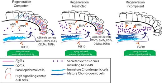 Fig. 6. Schematics describing the proposed model: secreted inhibitory factors associated with chondrogenic progression block AER cell formation. Secreted factors such as WNTs and BMPs support AER cell formation at the amputation plane. During development, chondrogenesis leads to the accumulation of secreted inhibitory factors, including NOGGIN, which results in failure to establish AER cells (Fgf8.L+/Lgr5.S+). FGF10 can suppress chondrogenesis. Amputations, independent of the regeneration outcome, induce injury-induced mesenchymal transcriptional plasticity. |