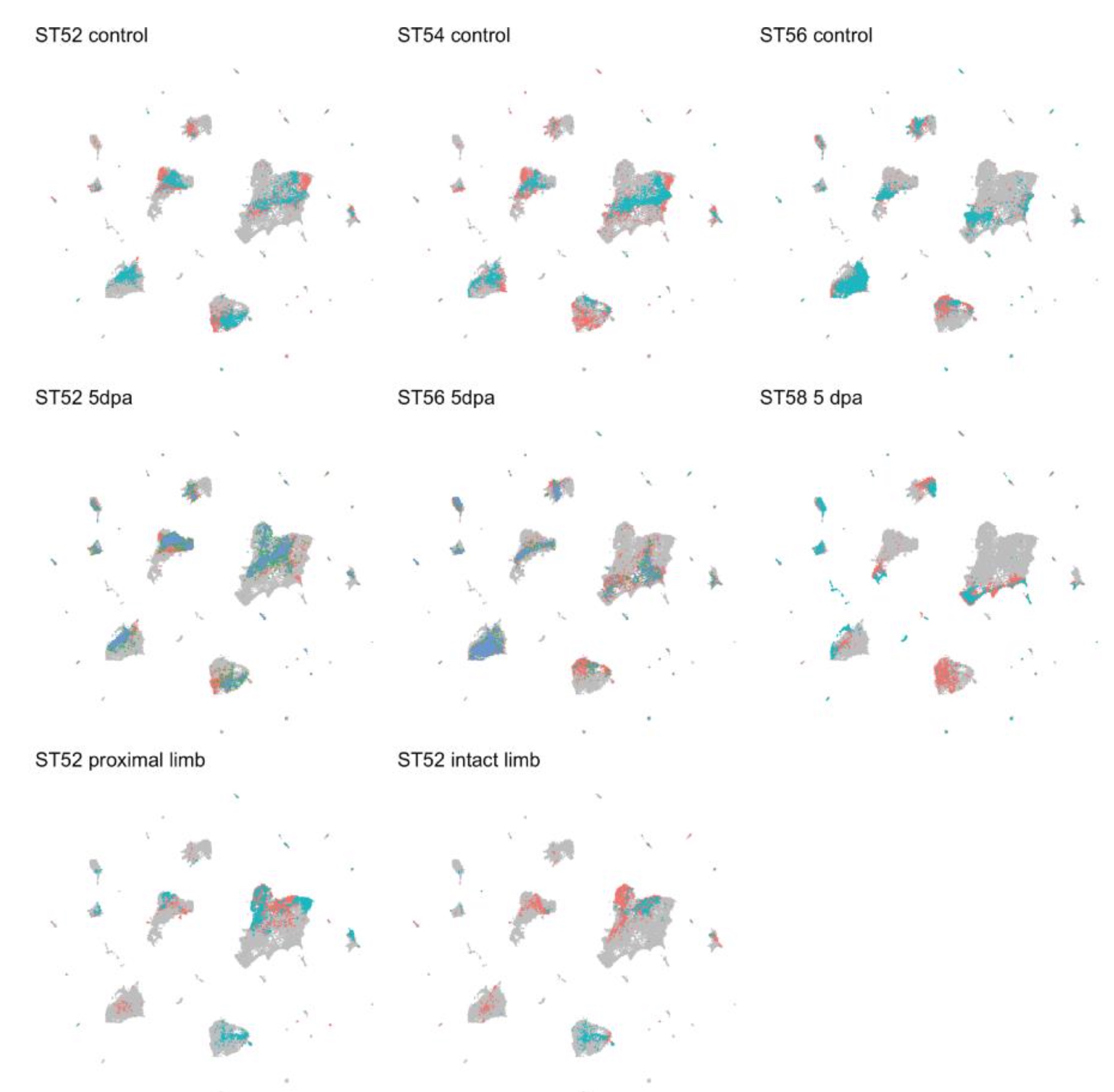 Figure S3: An atlas of cell types in developing and amputated limbs at different stages of regeneration-competence. Pooled UMAP visualization of Xenopus limb cells, with colors representing distinct cluster identities |