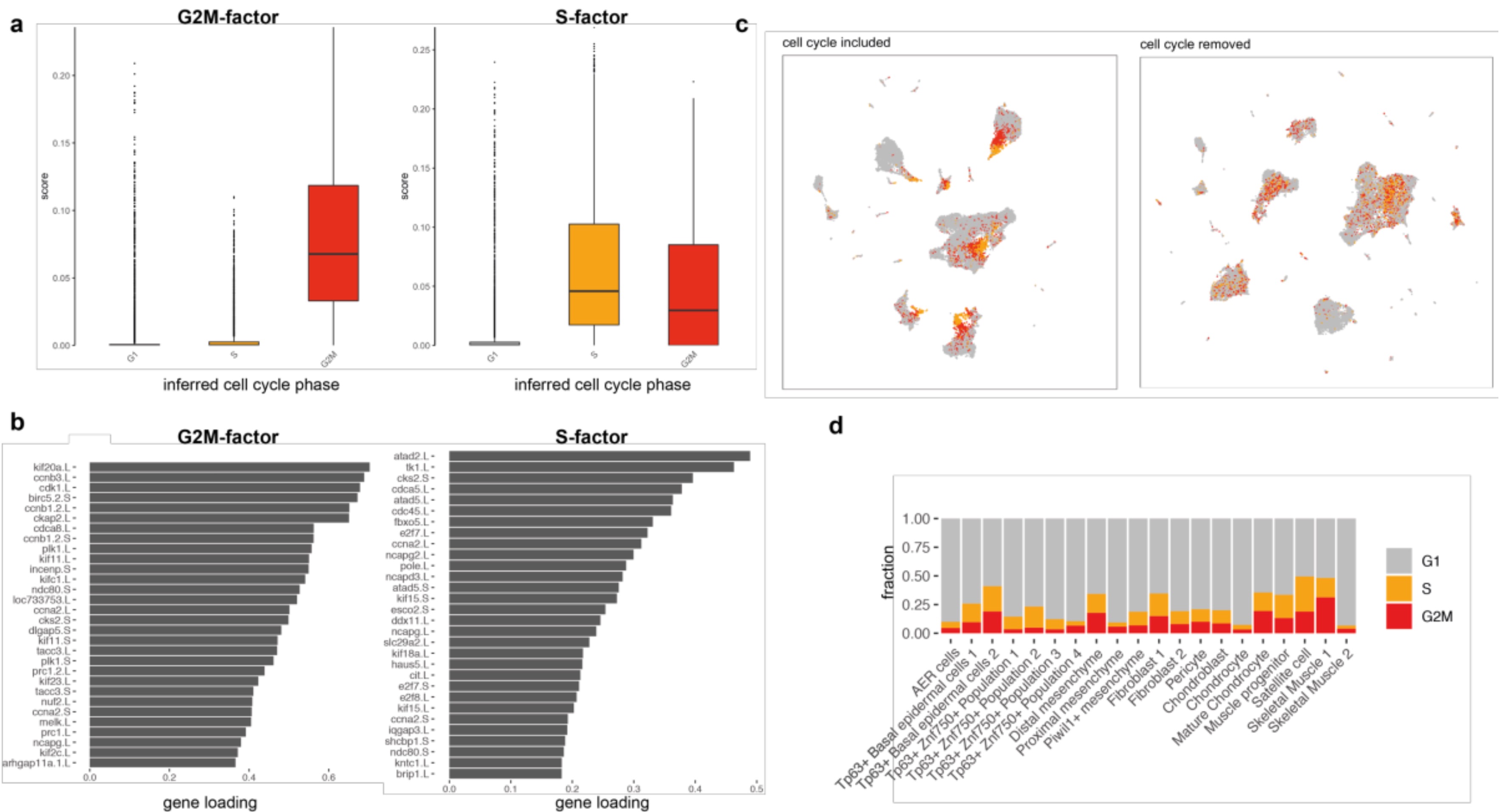 Figure S2: Detection and removal of the cell cycle signature. (a) Unbiased factor analysis identified two factors that correspond to computationally-inferred cell cycle phases (G2M-factor, left; S-factor, right). (b) Factor loadings for the top 30 genes associated with cell cycle factors. (c) Removal of genes with high loadings for either G2M- or S-factors significantly reduces the influence of cell cycle phase on the UMAP projection. Dot color indicates inferred cell cycle phase. (d) Inferred cell cycle states for selected cell types. |