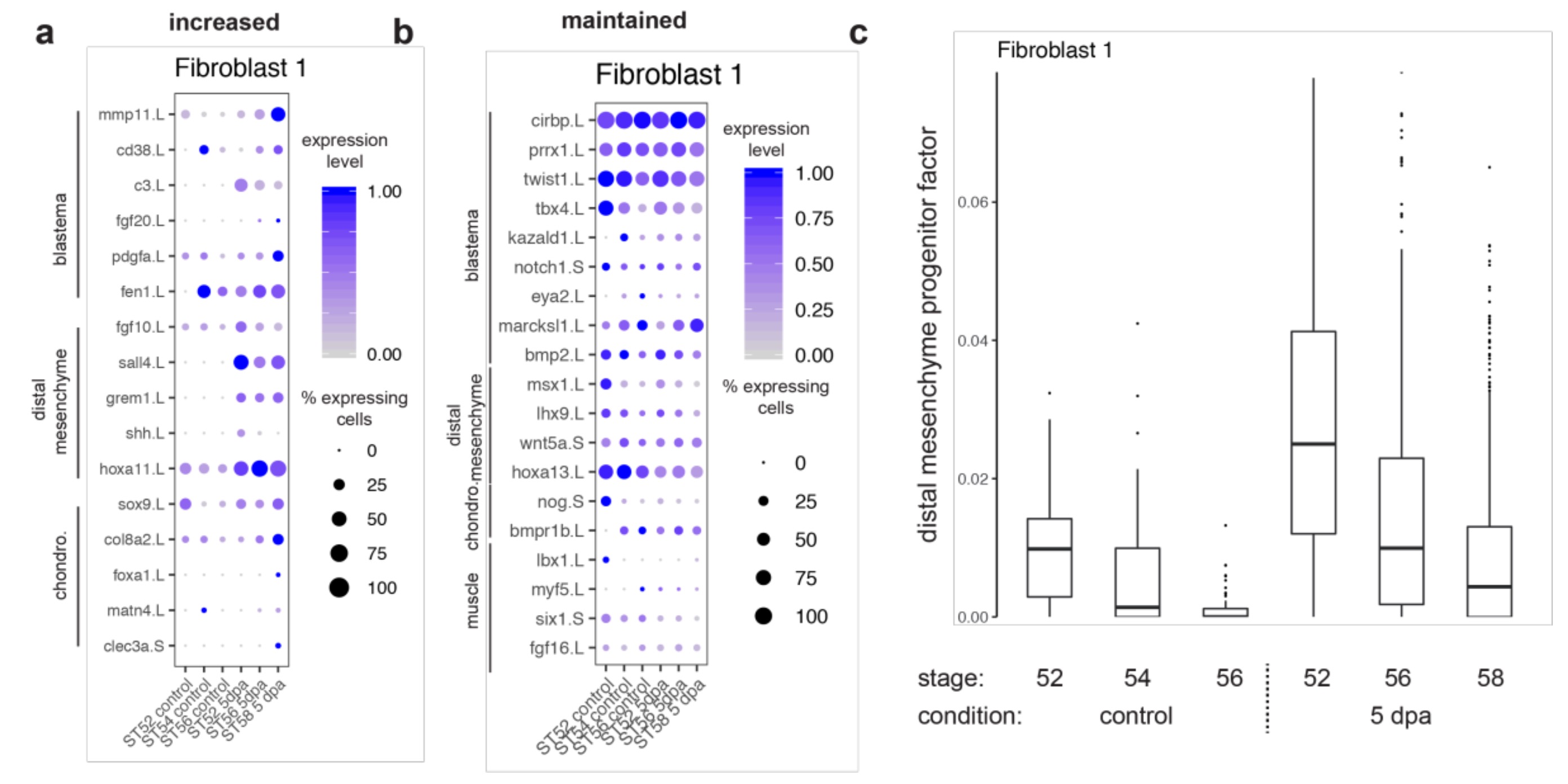 Figure S10: A subset of fibroblasts express dedifferentiation and blastema genes independently of the regeneration-outcome. Expression of genes and putative gene sets associated with regeneration in the Fibroblast 1 cluster, visualized using dotplots and factor analysis. (a) Expression of specific genes that increase upon amputation regardless of stage. (b) Expression of specific genes that are expressed in intact limbs and are maintained after injury. (c) Following amputation, the putative distal mesenchyme progenitor gene set (factor) increases in Fibroblast 1 cells across all stages. |