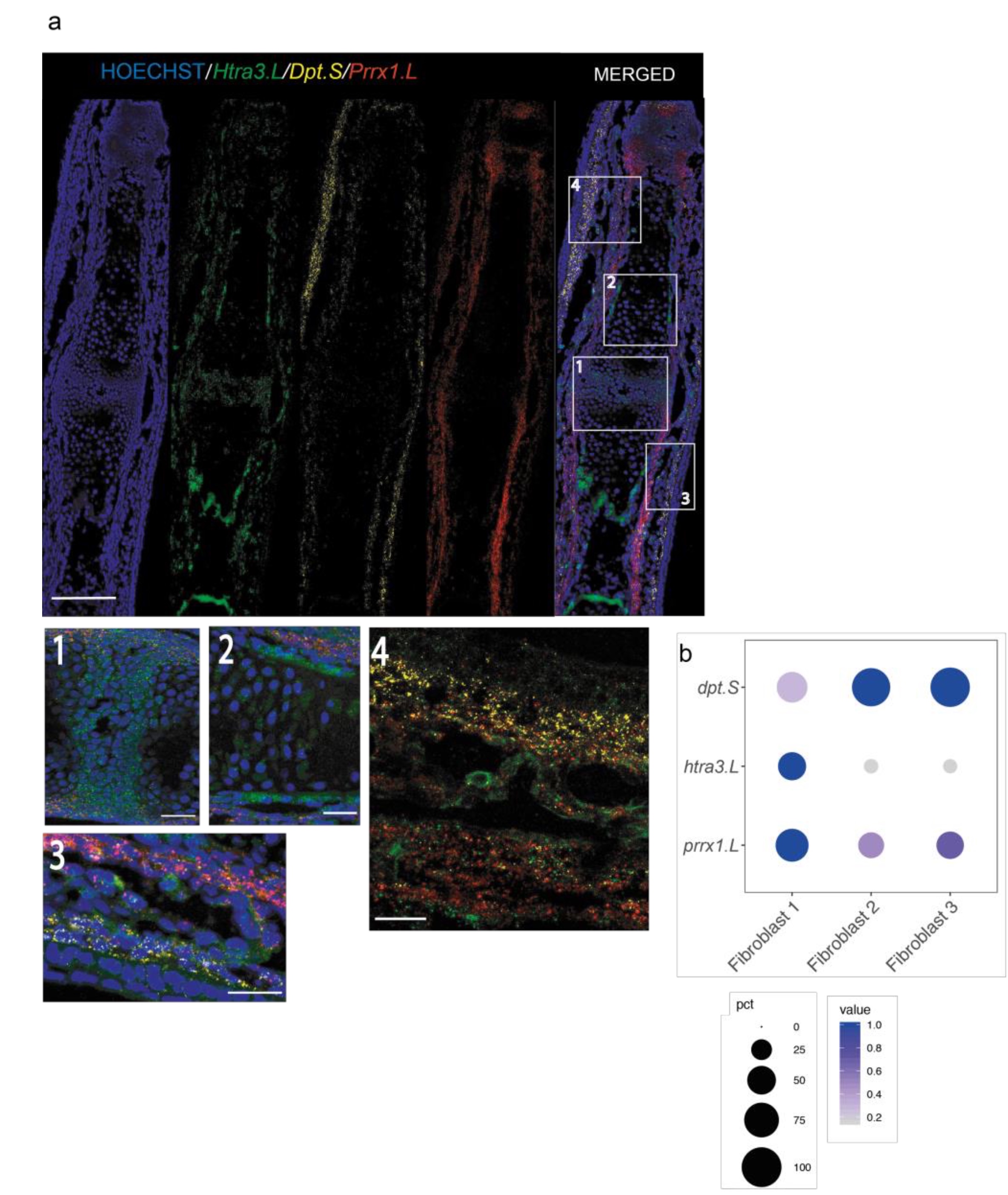 Figure S11: Fibroblast 1 cluster cells are largely found beneath skin cells and nearby perichondrial cells. (a) (Top) Confocal images of a Stage 56 digit stained against Htra3.L, Prrx1.L, and Dpt.S. Cells expressing Htra3.L/Prrx1.L/Dpt.S are found underneath the skin regions and nearby perichondrium regions. (Bottom) Zoomed in version of selected areas show: (1) joint forming regions are enriched for Htra3.L expression; (2) Inner perichondrial regions are enriched for Htra3.L and outer perichondrial regions are enriched for Prrx1.L expression. (3-4) Outerlayers of dermal fibroblast area enriched for Dpt.S and lower levels of Prrx1.L and Htra3.L. Inner layers of dermal fibroblasts/nearby perichondrial regions are enriched for higher Prrx1.L and lower Dpt.S and Htra3.L expressions. Blue, Hoechst; Green, Htra3.L mRNA; Red, Prrx1.L mRNA; Yellow, Dpt.S mRNA. Scale= 125 μm for top images, 25 μm for bottom no 1-3, and 20 μm for bottom no 4. (b) Dot plot showing expression of Htra3.L, Prrx1.L, and Dpt.S for Fibroblast 1, 2, and 3 clusters. |