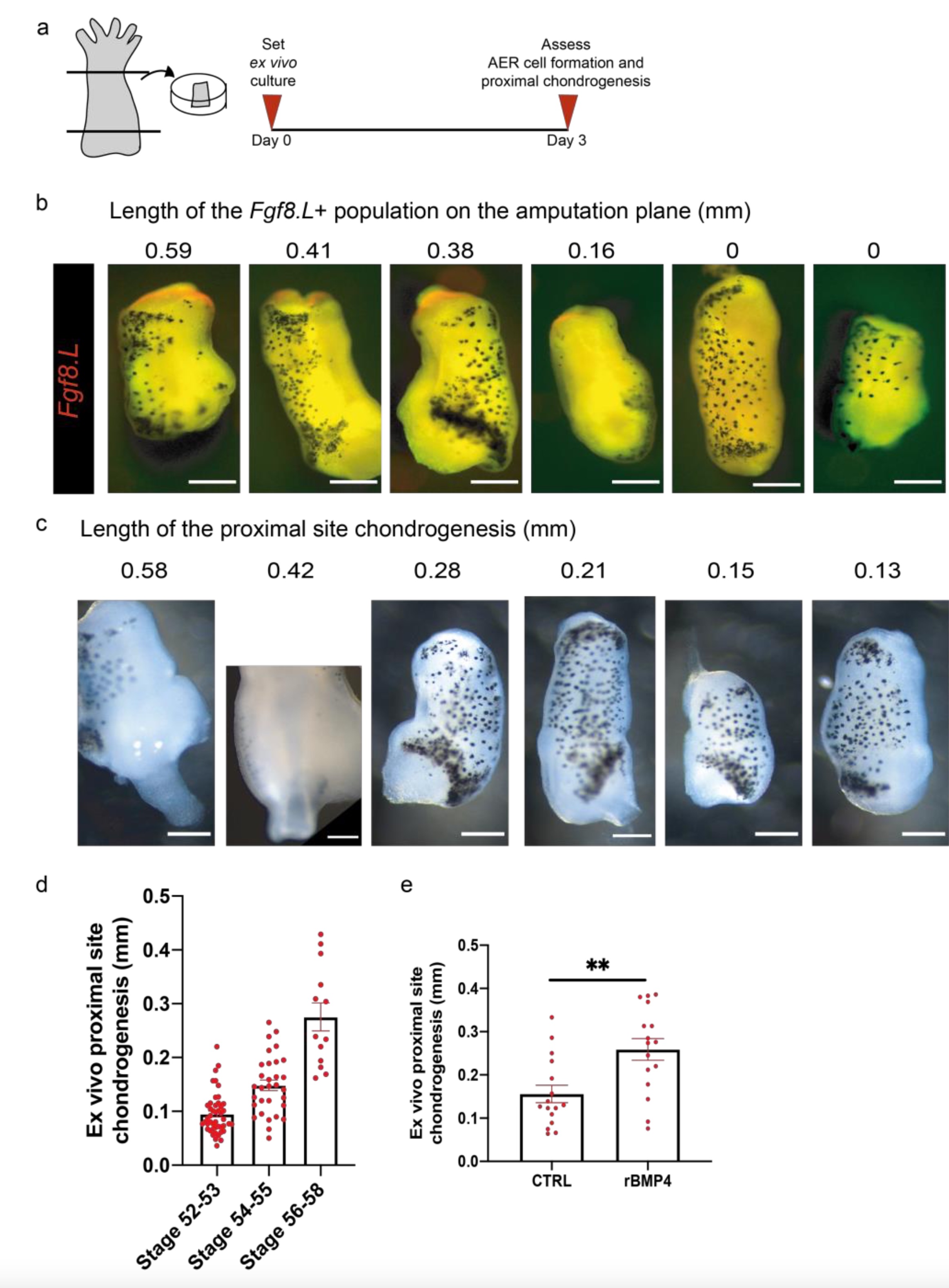 Figure S12: The distal site of ex vivo regenerating limbs can be used to detect AER cell formation, and the proximal site of explants can be used for detecting chondrogenesis. (a) Schematics describing the ex vivo culture protocol for assessing Fgf8.L mRNA expression at the distal site, and chondrogenesis levels at the proximal site. All assessments were carried out at 3-days post culture start. (b) Whole-mount stereomicroscope images of Fgf8.L stained limb explants at 3 dpa. Numbers at the top indicates AER cell formation measured as the length of Fgf8.L+ signal on the amputation plane. Red, Fgf8.L mRNA. Scale= 200 μm. (c) Whole- mount stereomicroscope images of chondrogenesis at the proximal site of explants at 3 dpa. Numbers at the top indicates the measured proximal chondrogenesis extent. Scale= 200 μm. (d) Ex vivo regenerating limb cultures can be used to investigate chondrogenesis. Explants were cultured for 3 days and chondrogenesis was measured as in (c). The extent of chondrogenesis seen at the proximal site of explants changes with the developmental stage and coincides with the progression of in vivo chondrogenesis (Dent, 1962). Regeneration- competent explants= total 46 samples from 4 biological replicates; Regeneration-restricted explants= total 31 samples from 3 biological replicates; Regeneration-incompetent explants= total 13 samples from 3 biological replicates. P**< 0.001. (e) Explants were cultured for 3 days with BMP4 and the extent of chondrogenesis was measured. Addition of recombinant BMP4 to the explant media increased the observed chondrogenesis at the proximal site. Control 0.1% BSA, total n= 16 samples from 4 biological replicates; recombinant BMP4, total n= 16 samples from 4 biological replicates. |