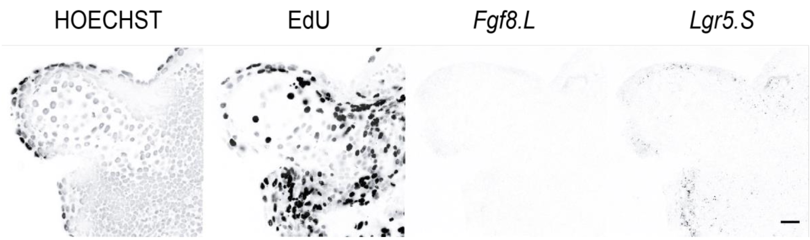 Figure S16: Inhibition of FGF receptor induces chondrogenic populations in the proximal explant. Example sectioned confocal images of proximal site of 3 dpa explants treated with SU5402 showing sparse circular nucleus indicative of chondrogenic cells as well as lack of Fgf8.L in epidermis. Scale bar = 15 μm. |