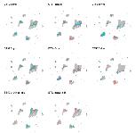 Figure S1: Contribution of different conditions to the pooled UMAP projection. UMAP visualization of cells from all conditions and replicates, allowing the identification of transcriptional changes that are consistent across replicates. Grey dots: cells from all samples; red, blue, green dots: cells from different biological replicates for the selected sample. |
