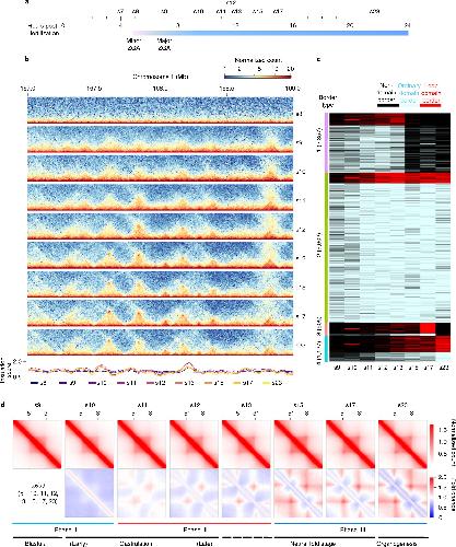 Fig. 2: De novo TAD establishment during embryogenesis of X. tropicalis. a, Schematic representation of the ten developmental stages examined by in situ Hi-C. b, Chromatin interaction frequency mapped at a 5-kb resolution. c, Clusters of TAD borders appear for ordinary domains (light blue), loop domains (red) and non-domains (black) at each specific developmental stage. âNon-domain borderâ refers to a genomic region not identified as a TAD border at a specific embryonic developmental stage, which switches to a TAD border at other development stages. d, Heatmaps of aggregated TADs for the eight developmental stages. The interaction frequency of aggregated TADs from s10 to s23 was normalized against s9. Three phases of change in the TAD structure are shown below, with the developmental stages also shown (TAD number at s9, s10, s11, s12, s13, s15, s17 and s23: 2,471, 2,805, 3,599, 4,036, 4,160, 3,164, 3,609 and 3,199). |