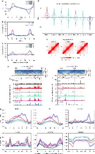 Extended Data Fig. 9. Chromatin switches between compartments A and B.Compartment switches are shown for each chromosome through multiple embryo developmental stages. Red and blue colors show chromatin in compartment A and B, respectively. Grey, yellow and purple lines show no switch, B to A, and A to B switch, respectively. |