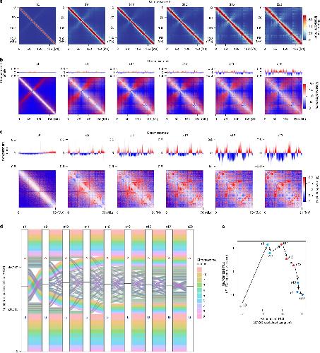 Fig. 7: Continuous compartmentalization during embryogenesis. a, Heatmaps of chromosome 2 plotted at a 50-kb resolution at multiple developmental stages. b, Hi-C matrices (observed/expected) for chromosome 2 at a 50-kb resolution at multiple developmental stages. c, Hi-C matrices (observed/expected) of an example region between 0 and 50âMb in chromosome 2. d, Chromatin switched between A and B compartments during embryo development. e, PCA of compartment scores derived from adjusted Cscore values of Hi-C matrices at multiple developmental stages. |