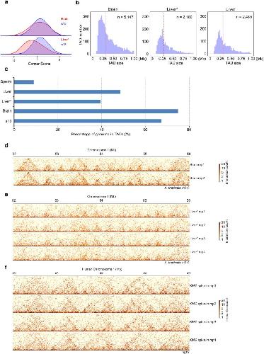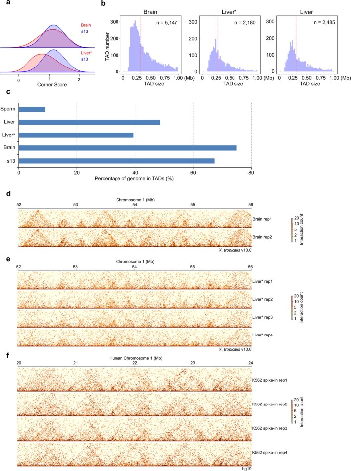 Extended Data Fig. 10. TAD structure in terminally differentiated brain and liver tissues.a, Comparison of arrowhead corner score distribution for s13 embryos, brain, and liver tissues. b, Number of TADs and size distribution. c, The percentage of genome folded into TADs in brain and liver tissues. d-f, Example regions to show TADs structure in biological replicate Hi-Cs for brain, liver, and spike-in K562 cells. For each Hi-C replicate, 8 million paired reads from the genome-wide interactions were randomly selected and used for the heatmap plotting. * indicates Hi-C on liver tissue with human K562 as spike-in control. |