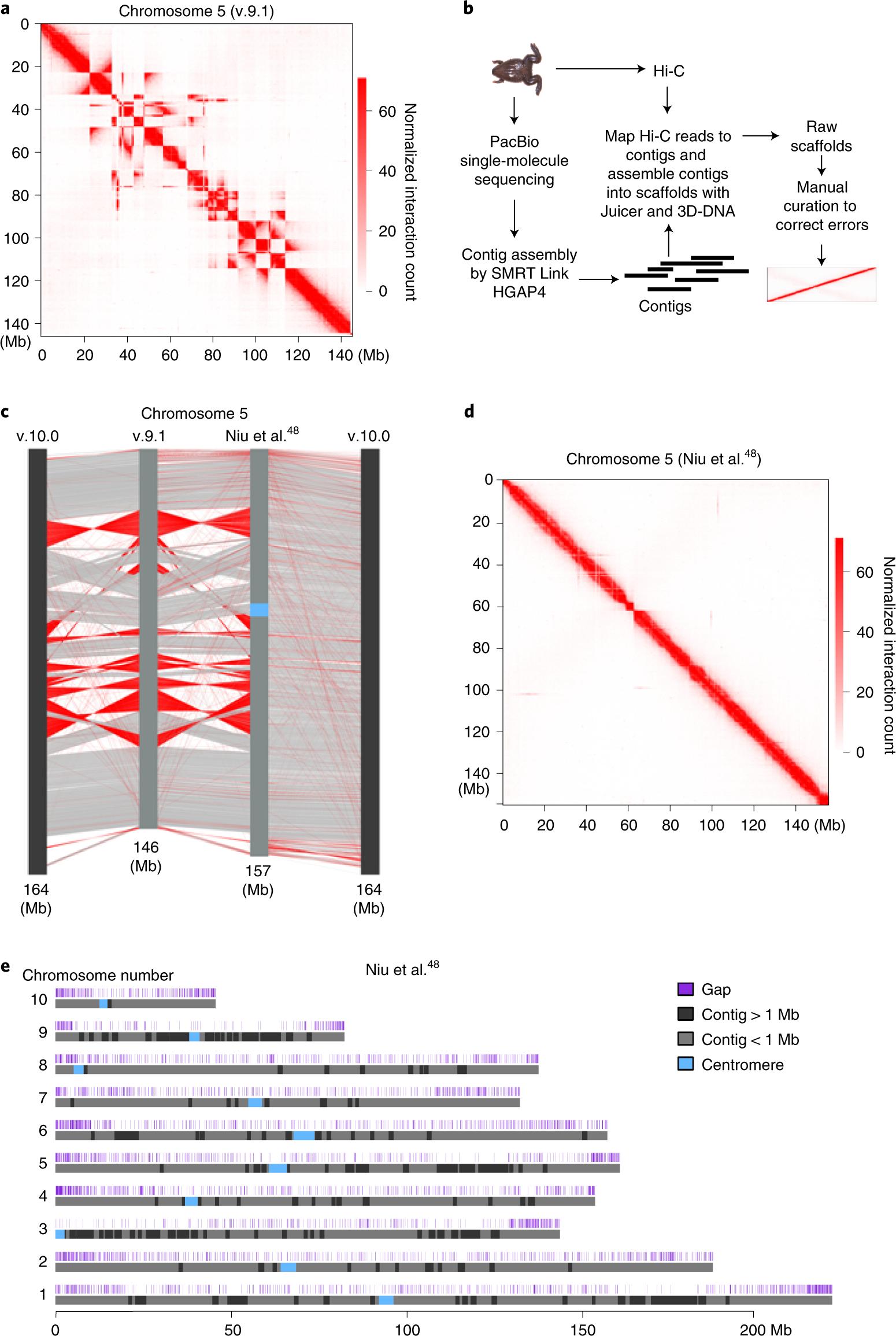 Fig. 1: De novo assembly of the reference genome of X. tropicalis by using Hi-C and single-molecule sequencing. a, Heatmap of chromosome 5 as an example to show assembly errors using the v.9.1 reference genome of X. tropicalis. b, Procedure of de novo assembly of the reference genome of X. tropicalis. c, Comparison between the v.9.1, de novo assembled and v.10.0 chromosome 5. The red lines show sequences with the orientation reversed. d, Heatmap of chromosome 5 to show that assembly errors are mostly corrected in the new version of the reference genome. e, Ideograms of X. tropicalis new reference pseudomolecules. The top track shows the positions of gaps (dark blue). Contigs longer than 1 Mb are shown in black and contigs shorter than 1 Mb are shown in light gray. The Hi-C datasets for genome assembly were generated from s9 embryos. |