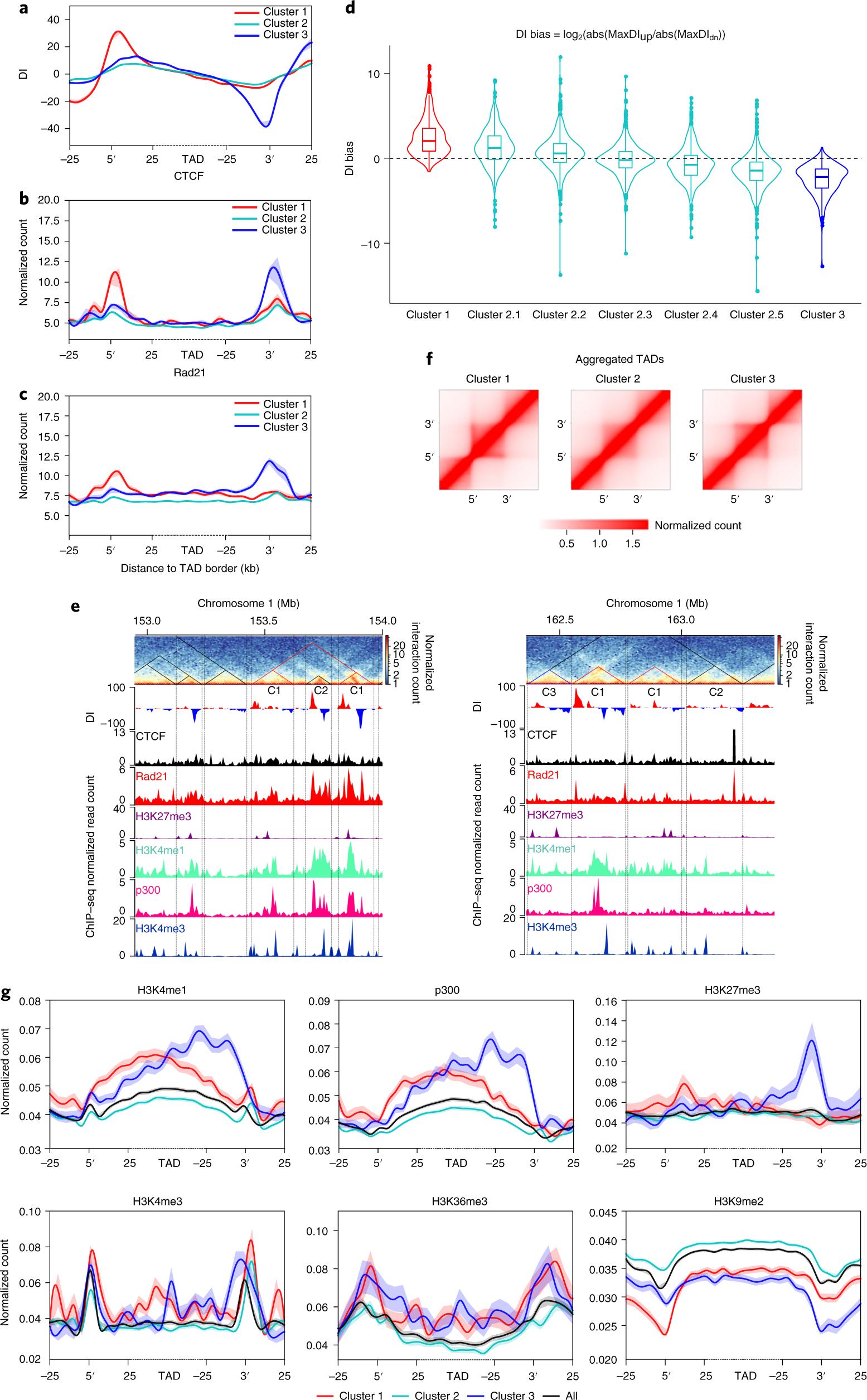 Fig. 3: Orientation-biased CTCF and Rad21 enrichment at TAD borders of higher DI values. a, DI for three clusters of TADs identified in embryos at s13: 555, 3,191 and 414 TADs in clusters 1, 2 and 3, respectively. b, CTCF enrichment is biased to borders with higher DI values. c, Rad21 enrichment is biased to borders with higher DI values and drops toward the border on the other side of the TAD. aâc, Data are presented as the meanâ±âs.e.m. d, DI for TADs of cluster 1, five subclusters of clusters 2 and cluster 3. According to the ranking of DI strength, TADs in cluster 2 were divided into five subclusters. Data are presented as box plots within violin plots. The minima, maxima, center and bounds of each box plot refers to quartile 1â1.5 interquartile range, quartile 3â+â1.5 interquartile range, median, first and third quartiles of the data. e, Examples of TADs for the three different clusters. f, Aggregated heatmaps for three clusters of TADs. g, Histone modifications and p300 enrichment patterns across the borders of three clusters of TADs. Data are presented as the meanâ±âs.e.m. |