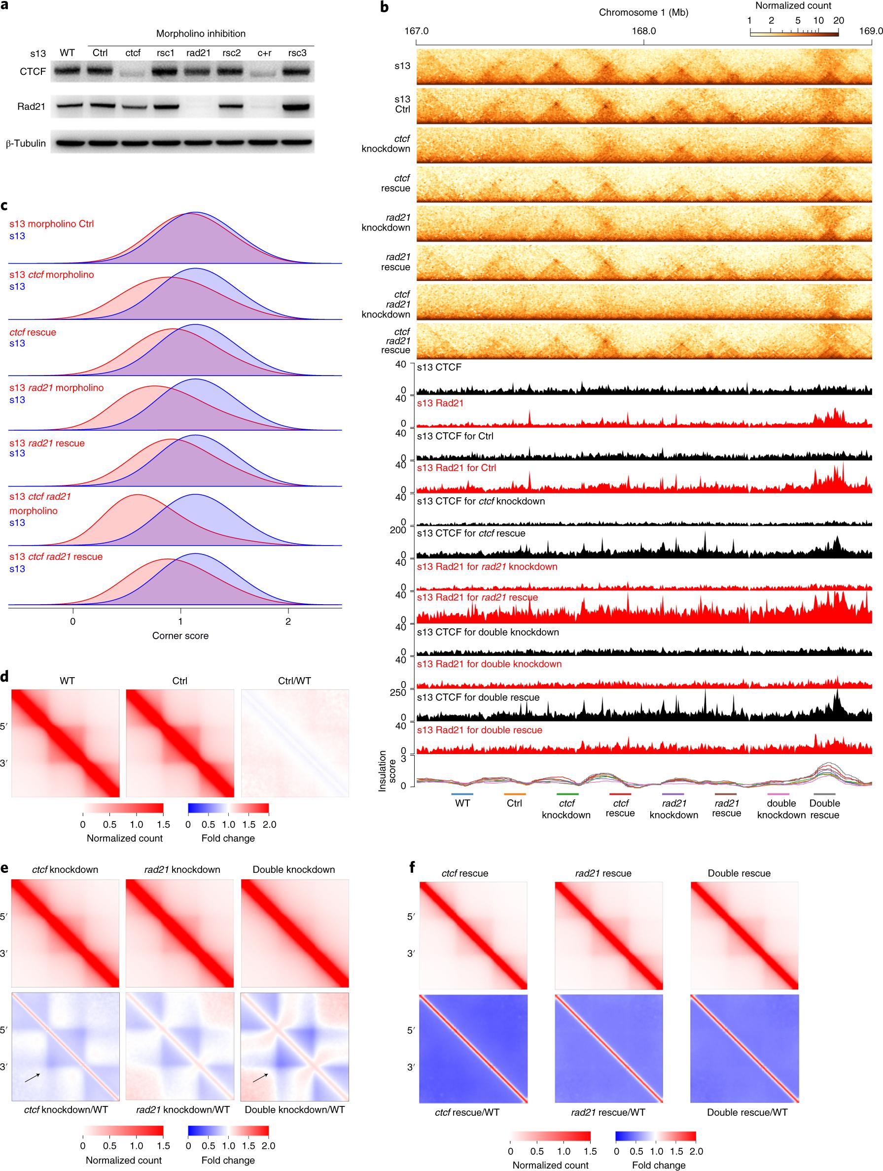 Fig. 5: Requirement of CTCF and Rad21 for TAD establishment in X. tropicalis embryos. a, Western blot of CTCF and Rad21 knockdown by morpholinos in embryos at s13. WT, morpholino control (Ctrl), CTCF morpholino (ctcf), Rad21 morpholino (rad21), ctcf rescue (rsc1), rad21 rescue (rsc2), CTCF and Rad21 morpholinos (c+r) and double rescue of ctcf and rad21 (rsc3) are shown. See Supplementary Table 4 for the gene coding sequences for rescue. The western blot experiments in this figure were repeated at least twice with similar results. b, Example region showing the knockdown and rescue effect on TAD structures. y axis: normalized ChIPâseq read count. c, Arrowhead corner score distribution for WT, morpholino Ctrl and knockdowns with CTCF morpholino, Rad21 morpholino, combined CTCF and Rad21 morpholinos and rescued. All experiments were carried out on s13 embryos. Higher corner score values on the x axis indicate a greater likelihood of being at the corner of a domain; the height of the curve indicates the density of corner score values within a specific range. d, Heatmaps of aggregated TADs in WT and Ctrl embryos. e, Heatmaps of aggregated TADs in CTCF and Rad21 knockdown embryos. f, Heatmaps of aggregated TADs in CTCF and Rad21 expressionârescued embryos. In dâf, The black arrows point to interacting borders. The interaction frequency of aggregated TADs was normalized against WT s13. |
