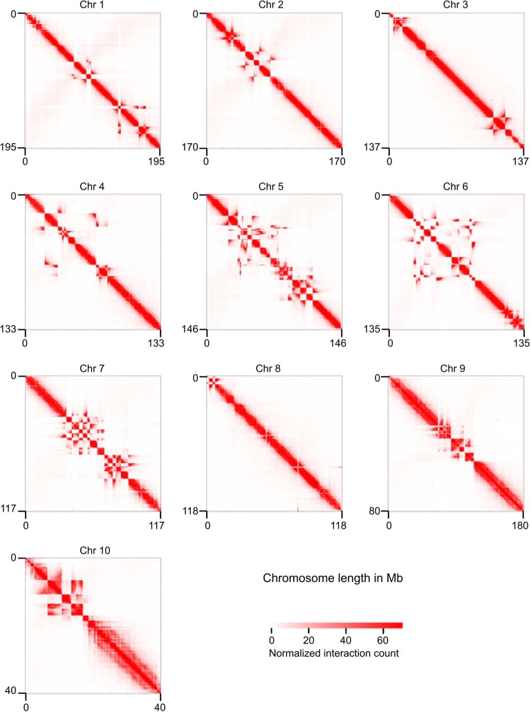 Extended Data Fig. 1. Heatmap of contact frequency for each chromosome.Assembly errors are shown using the v9.1 reference genome of X. tropicalis for heatmap plotting. Embryos from stage 9 were used for the Hi-C library preparation for Extended Data Figs. 1 and 2. |