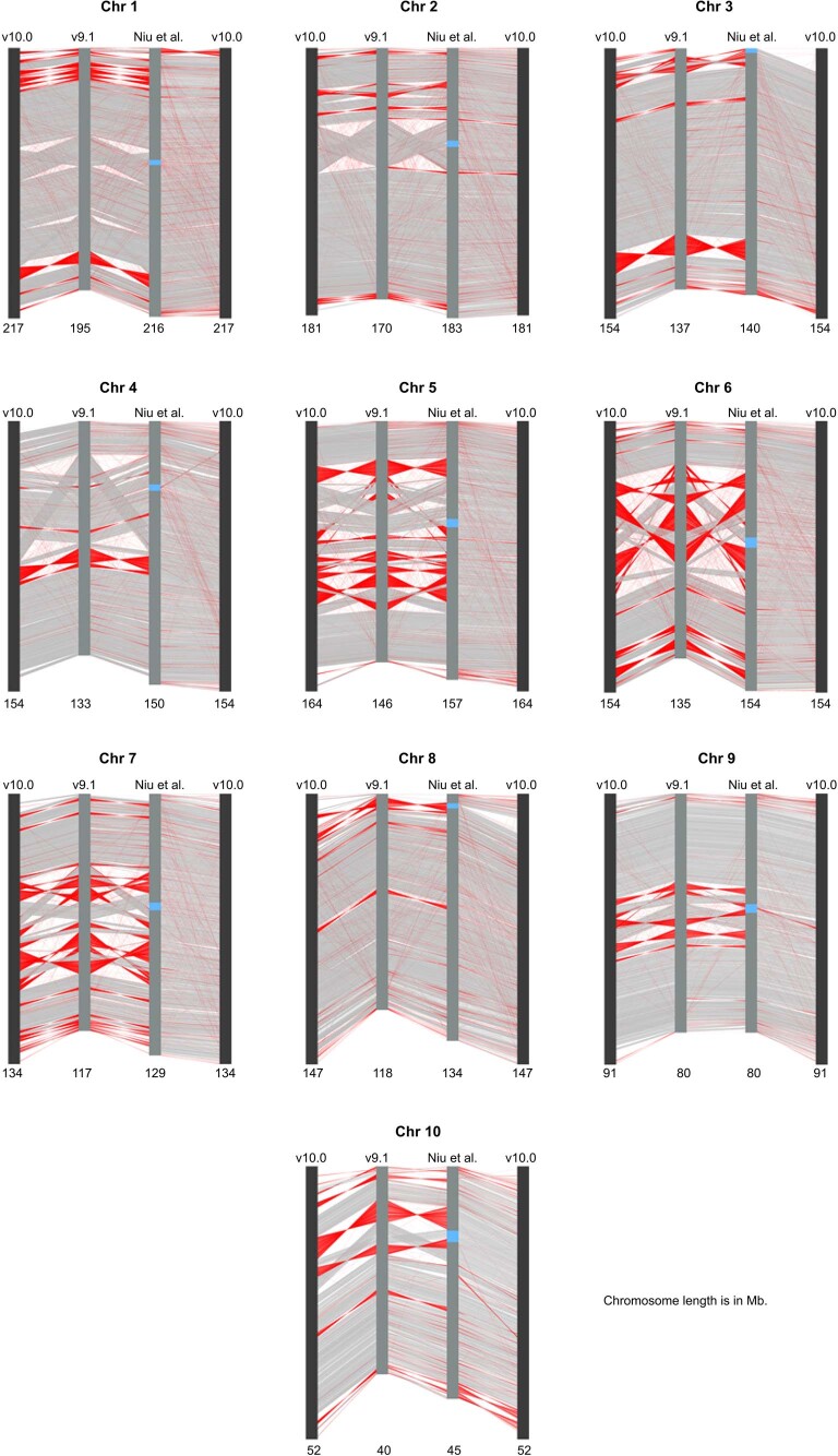 Extended Data Fig. 2. Comparison of v9.1, Niu et al. assembled, and v10.0 genome for each chromosome.Red lines show sequences with orientations reversed. |