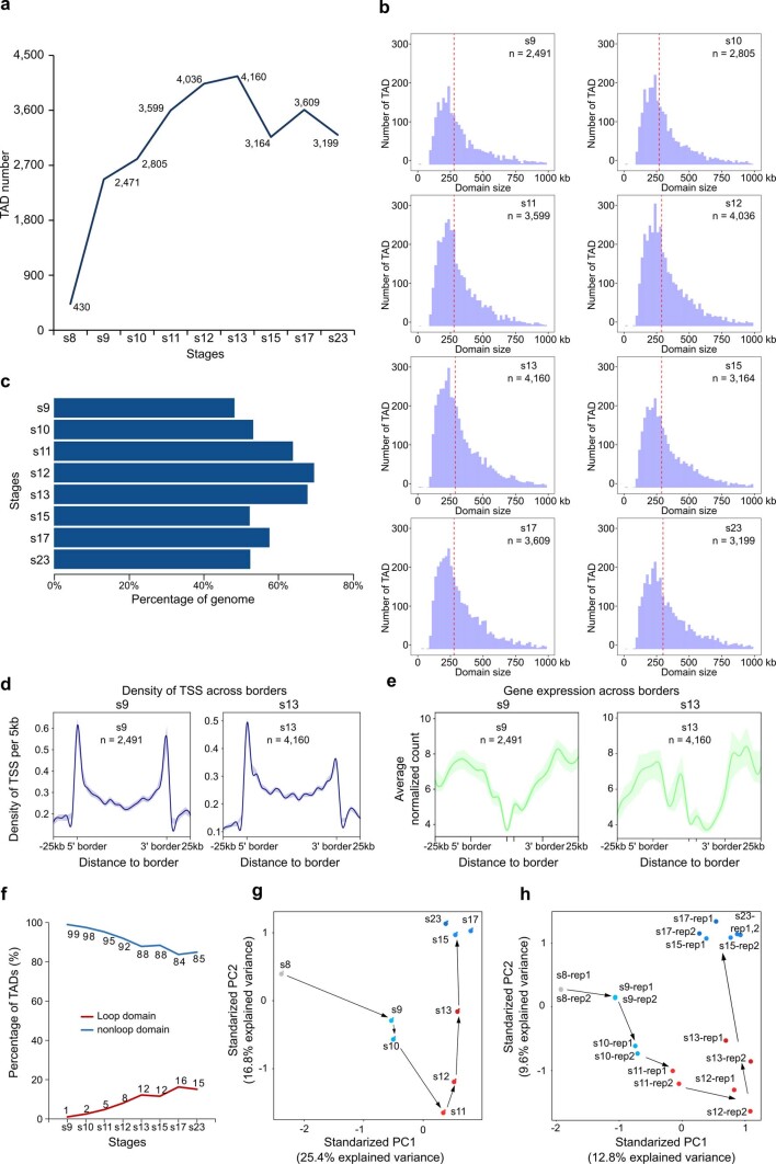 Extended Data Fig. 3. Analysis for TADs identified at different developmental stages.a, Number of TADs identified at different developmental stages. b, TAD size distribution at different developmental stages. c, Percentage of genome folded into TADs at different developmental stages. d, Density of TSS across TAD borders at s9 and s13. e, Gene expression level across TAD borders at s9 and s13. Data in d and e are represented as mean±SEM. f, Loop and ordinary domains identified at different developmental stages. g & h, PCA analysis of insulation scores for Hi-Cs on embryos at different developmental stages. |