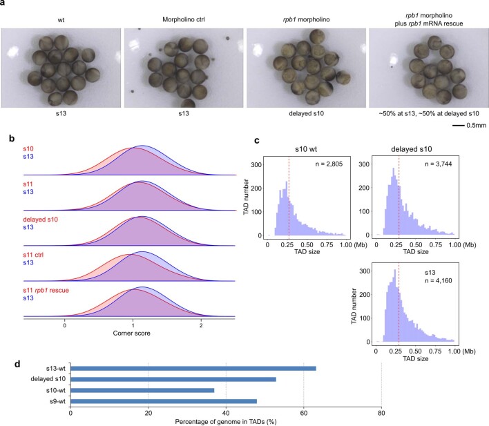 Extended Data Fig. 6. Effects of rpb1 knock-down on TAD establishment.a, Effect of rpb1 knock-down on embryo development. Knock-down of rpb1 was repeated for at least two times with similar results. b, Arrowhead corner score distribution. c, TAD size distribution. d, Percentage of genome folds in TADs. |