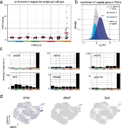 Fig. 4. Tracking the fate of maternal transcripts by scSLAM-seq.a Fold change enrichment of maternal vegetally localized genes in the different cell types versus all other cells (color code as in Fig. 3d). Genes with an average expression <0.1 transcripts/cell were excluded from this analysis. Red bars represent mean values. b Deconvolution of the bimodal distribution of vegetally localized genes in PGCs (black dashed line) into two normal distributions (light and dark blue). The mean value of the dark blue distribution is significantly higher than that of a randomly sampled distribution (mgray = 0.4, mdark blue = 1.52, p value = 1.7 × 10−4, Welch’s t test, one-sided). c Average expression of most highly enriched genes in PGCs in different cell types (color code as in Fig. 3d). d Unlabeled RNA expression of established germ cell markers on a UMAP representation. |