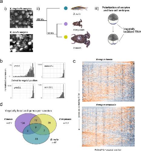 Fig. 5. Evolutionary conservation of vegetal mRNA localization.a (i) Light microscopy view of whole oocyte lobes from X. laevis and X. tropicalis before dissociation for one of the two replicates. Scale bar are 500âµm. (ii) Phylogenetic distance of Xenopus species and zebrafish as described in ref. 74 (Ma: million years). (iii) Deposition of germ plasm and dorsal factors (as purple dots) in Xenopus oocytes and after first cell division. b Tomo-seq tracks of vegetally localized genes rtn3.L, nanos1.L, grip2.L, and trim36.L in X. laevis. c Heatmap of z-score normalized expression per section in Xenopus oocytes. Genes on the y-axis as sorted into profiles 1â50 by SOM (self-organizing map), spatial position on the x-axis. d Overlap of vegetally localized genes in zebrafish and Xenopus species, considering only genes that were expressed in all three species at the respective developmental stage. |