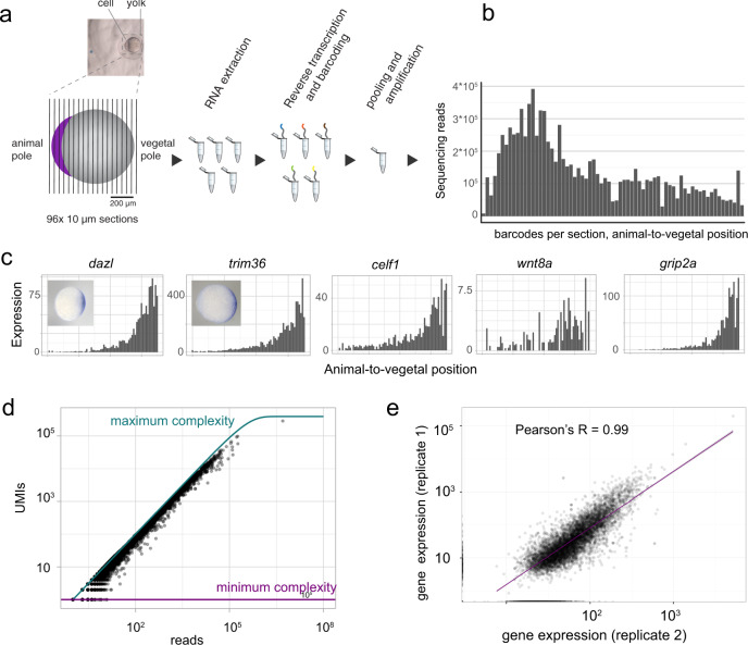Fig. 1. Tomo-seq in one-cell stage embryos.a Experimental outline: the embedded embryo is cryosectioned into 96 slices that are put into separate tubes. After adding spike-in control RNA, RNA is extracted. In a reverse transcription step, spatial barcodes are introduced. Samples are then pooled and amplified by in vitro transcription and a final library PCR. Scale bars are 200âµm. b Histogram shows raw transcript counts per section. c Tomo-seq tracks for the known vegetally localized genes dazl, trim36, celf1, wnt8a, and grip2a and whole-mount in situ hybridizations for dazl and trim36. d Sequencing depth, shown as UMI saturation per gene. Maximum complexity is determined as by Grün et al.73. e Correlation of two tomo-seq experiments (total counts summed over all sections). Line is a linear fit to the data. The difference in scale between the two axes is caused by differences in sequencing depth between the two replicates. |