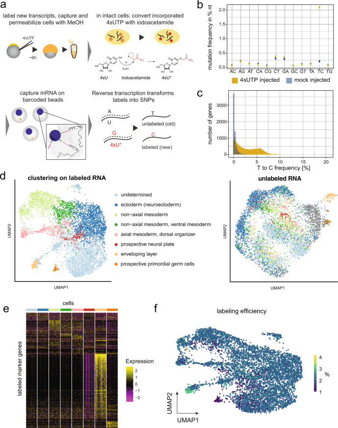 Fig. 3. Single-cell RNA labeling in early zebrafish embryos.a Schematic representation of the protocol: 4sUTP (4-thiouridine-triphosphate) injection into zebrafish one-cell stage embryos, dechorionation, dissociation into single cells at gastrulation stage, and MeOH (methanol) fixation (see “Methods” section). Incorporated 4sUTP is converted in a SN2 reaction with iodoacetamide into a cytosine analog. The single-cell solution is then loaded onto 10× Genomics Chromium, and chemical labels lead to T-to-C conversions during reverse transcription. b Nucleotide mutation frequencies of a scSLAM-seq library after injecting 4sUTP or Tris and quality filtering of the data. c Histogram of T-to-C mutations in 4sUTP- and Tris-injected embryos. d UMAP representation of cells based on labeled RNA (left side) and unlabeled RNA (right side). For the latter, we imposed cell identities as determined on the basis of labeled RNA. e Marker gene expression of labeled cells in different cell types (color code as in d). Cell number per cluster was downsampled to equal numbers. f Transcript labeling efficiency in single cells in percent, projected on the UMAP representation for labeled RNA. |
