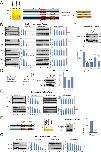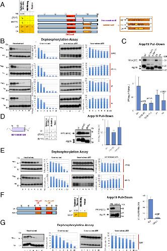 Fig. 5. A specific sequence on the cassette motif of Arpp19 and a critical distance between this region and the DSG motif are essential for the correct timing of S67/S71 dephosphorylation.A Schematic representation of the âinter-cassetteâ (sequence 78â95) and the âcassetteâ (sequence 96â111) deleted regions of Arpp19, as well as the residues on the âcassette motifâ that have been mutated into alanine. B Dephosphorylation of S67/S71 of the indicated Arpp19 mutants in kinase-inactivated extracts devoid or not of B55. The amount of Arpp19 in each sample was assessed by western blotting. Data were quantified and represented as the mean percentage of phosphorylation remainingâ±âSD; nâ=â3 biological independent samples. C Western blotting showing the association of B55 to the indicated mutants of Arpp19 as well as the quantification of B55/Arpp19 mean ratioâ±âSD. Two-tailed unpaired Studentâs t-tests were performed in each pulldown to determine statistical relevance. p vs. wild-type Arpp19 is shown; nâ=â3 biological independent samples for mutants D(78â95), D(96â111) and 2âA; nâ=â6 for the wild-type form and nâ=â4 for the 6A mutant. D Scheme depicting the two regions that have been deleted in the âinter-cassetteâ motif. Table illustrating data on S67/S71 dephosphorylation timing as well as the capacity to bind B55 and to restore mitosis of the two mutants. Western blotting showing the amount of B55 present in the His-App19 pulldown assays of the indicated Arpp19 mutant forms. Graph bar representing the mean B55/Arpp19 ratioâ±âSD; nâ=â3 biological independent samples. E S67/S71 dephosphorylation assays of the indicated mutants of Arpp19 in kinase-inactivated extracts devoid or not of B55. Results were quantified and represented as the mean percentage of phosphorylation remainingâ±âSD; nâ=â3 biological independent samples. F A schematic of the DSG (D1) and the cassette (D2) regions of Arpp19 that have been exchanged in the D2-D1 mutant. A table with the dephosphorylation, binding and rescue results is also shown. The association of B55 to the D2-D1 mutant compared to the wild-type Arpp19 and the quantification of the mean B55/Arpp19â±âSD are shown. Two-tailed unpaired Studentâs t-tests were performed in each pulldown to determine statistical relevance. p vs. wild-type Arpp19 is shown; nâ=â3 biological independent samples. G Dephosphorylation assay of S67/S71 of the wild type and the D2-D1 mutant in kinase-inactivated extracts that have been depleted or not of B55. Data from three experiments were represented as the mean percentage of phosphorylation remainingâ±âSD. nâ=â3 biological independent samples. |