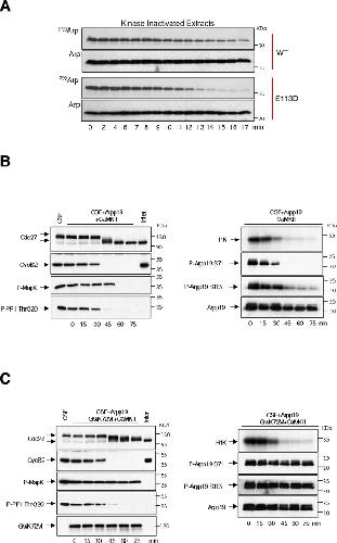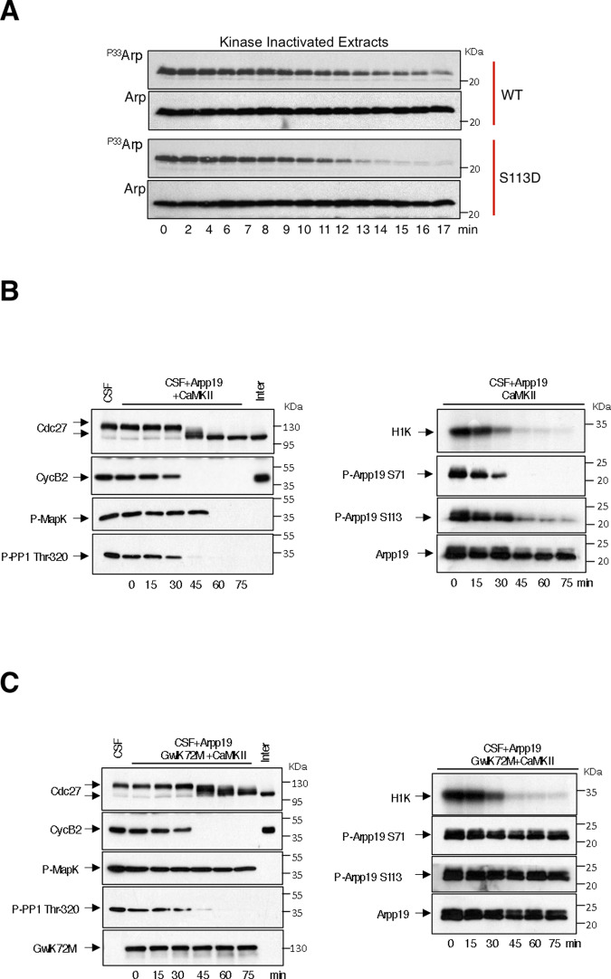 Fig. 6. Phosphorylation of S109/S113 modifies the temporal pattern of S67/S71 dephosphorylation.A Wild type and S109/S113D Arpp19 mutant were phosphorylated âin vitroâ with of [γ33P] ATP by GwlK72M on S67/S71 and supplemented to kinase-inactivated Xenopus egg extracts. The dephosphorylation of this residue was analysed at the indicated times by autoradiography (P33Arp) and the amount of Arpp19 in each sample measured by western blotting (Arp). B CytoStatic Factor (CSF) egg extracts were supplemented with a trace level of Arpp19-purified protein and activated to exit meiosis by the addition of active CamKII. The levels and dephosphorylation of the indicated proteins were analysed by western blotting, whereas Cyclin B/Cdk1 activity was measured by histone H1 phosphorylation (H1K). âInterâ denotes interphase egg extracts. C As for C, except that S67/S71 Arpp19 dephosphorylation and PP2A-B55 reactivation upon meiosis exit in these extracts was blocked by the concomitant addition of GwlK72M-purified protein. |