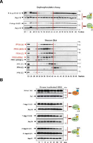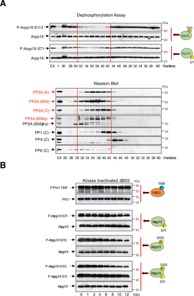 Fig. 8. PP2A-B55 is the phosphatase responsible of the dephosphorylation of Arpp19 on S109/S113.A Kinase-inactivated Xenopus egg extracts were submitted to gel filtration chromatography and eluted fractions subsequently supplemented with Arpp19 phosphorylated âin vitroâ on either S109/S113 or S67/S71. The dephosphorylation of these residues and the amount of Arpp19 were then measured by western blotting (upper panels, dephosphorylation assay). âEXâ and 1 correspond to phosphorylation at time 0 and 10 minutes respectively, of the indicated residues upon directly mixing with a kinase-inactivated extract. The presence of the indicated proteins in elution fractions and in the kinase-inactivated extract sample were assessed by western blotting (lower panels, western blotting). Red lines highlight the fractions displaying S109/S113 and S67/S71 dephosphorylation activity. The name of the proteins whose level picked in these fractions are also depicted in red. B Prc1 âin vitroâ phosphorylated on T481 by purified Cyclin A/Cdk and Arpp19 phosphorylated on either S67/S71 or on S109/S113 were supplemented together or separately to kinase-inactivated extracts depleted of B55 and the dephosphorylation of the corresponding residues analysed over the time by western blotting. Data of the figure are confirmed in three different experiments. |
