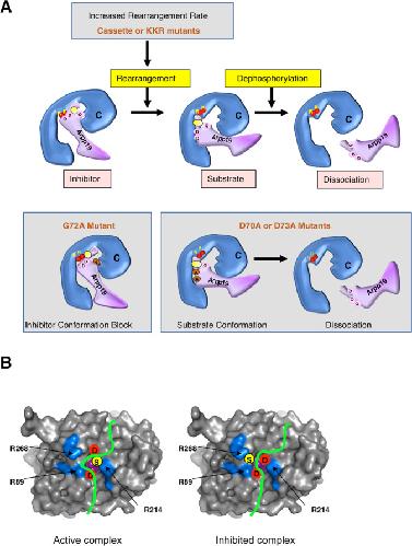 Fig. 10. Putative docking of the DSG motif of Arpp19 into the active site of PP2A-B55.A The docking of phospho-S67/S71 of Arpp19 into PP2A catalytic subunit (C) as an inhibitor conformation, its rearrangement towards a substrate conformation and its final dissociation upon dephosphorylation. Phosphorylation of S67/S71 is represented (yellow circle). The two aspartic residues D70 and D73 (pink circles) that could interact with the metallic centre (red circles) and with the two arginine residues (R) of the PP2A C subunit are shown. The putative effects of KKR/AAA, G72A, and D70A/D73A mutants of Arpp19 on the docking conformation of phospho-S67/S71 are indicated. B Putative docking of the DSG motif of Arpp19 into the active site of PP2A-B55 (PDB2IE4)24. Left: conformation of the peptide orientating the phosphorylated serine (yellow circle) toward the catalytic centre with the two aspartates (red circles) pointing toward nearby arginines (R89 and R214). Right: inhibited form in which the phosphorylated serine points outside (toward R268), while the dications (violet spheres) from the catalytic centre are chelated by one or two aspartates from the DSG motif. |