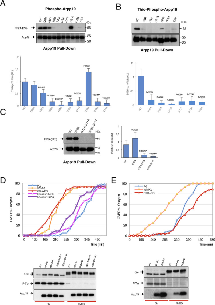 Fig. 3. S67/S71 catalysis and PP2A-B55 interaction regulate each other to confer a proper timing of PP2A-B55 inhibition.A B55 levels associated to 20âng of wild type or the indicated DSG mutants of His-Arpp19-pulldowns. Arpp19 amount in these pulldowns is also shown. Data were represented as mean B55/Arpp19 ratioâ±âSD. Two-tailed unpaired Studentâs t-tests were performed in each pulldown to determine statistical relevance. p vs. wild-type Arpp19 is shown; nâ=â3 biological independent samples for mutants Y68A, G72A and Y74A; nâ=â5 for the D73A, nâ=â6 for the wild-type form and nâ=â4 for the rest. B The wild type and the indicated DSG mutant forms of Arpp19 were thio-phosphorylated and used for His-pulldown. B55 and Arpp19 levels were checked by western blotting and shown. The B55/Arpp19 ratios were quantified and represented in a bar graph as meanâ±âSD. Two-tailed unpaired Student t-tests were performed in each pulldown to determine statistical relevance. p vs. wild-type Arpp19 is shown; nâ=â3 biological independent samples. C The B55/Arpp19 ratios were obtained as in A for the indicated mutants and represented in a bar graph as meanâ±âSD. Two-tailed unpaired; p vs. wild-type Arpp19 is shown; nâ=â3 biological independent samples for the wild-type form; nâ=â8 for the G72A mutant, nâ=â5 for the G72A-S71A mutant and nâ=â3 for the G72A-S71T mutant. D Prophase oocytes were injected or not (PG) with 50âng of the wild-type His-Arpp19 protein or with the indicated mutant forms and, 1âh later, treated with progesterone. GVBD was then scored as a function of time. Germinal vesicle (GV) and mature oocytes (GVBD) were western blotted to determine the levels of the injected protein, as well as the phosphorylation of Gwl and of the inhibitory site of Cdk1 Tyrosine 15. E As for E, except that the indicated mutant form of Arpp19 was used. |