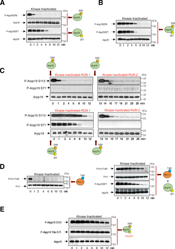 Fig. 7. Dependency of S109/S113 dephosphorylation on the phosphorylation of S67/S71 of Arpp19.A Arpp19 phosphorylated âin vitroâ in S67/S71 or S109/S113 residues by Gwl or PKA, respectively, were separately supplemented to kinase-inactivated Xenopus egg extracts and the dephosphorylation rate of each site, as well as the total amount of this protein were analysed by western blotting. B Arpp19 âin vitroâ-phosphorylated by Gwl and Arpp19 âin vitroâ-phosphorylated by PKA were mixed together into kinase-inactivated extracts and the dephosphorylation of each of these sites analysed at the indicated time points. C In a first run of dephosphorylation, a pulse of Arpp19 phosphorylated by PKA or by both PKA and Gwl was supplemented to kinase-inactivated extracts. Samples were then recovered at the indicated time points. After 12âmin, a second round of dephosphorylation was performed in these extracts upon the re-addition of a new pulse of Arpp19 phosphorylated âin vitroâ by PKA on S109/S113. Phosphorylation of S67/S71 and S109/S113 in the samples were evaluated by western blotting with specific phospho-antibodies. D Prc1 was phosphorylated âin vitroâ by purified Cyclin A/Cdk and supplemented alone (left panels) or together with phospho-S67/S71 Arpp19 (right panels) to kinase-inactivated extracts and the phosphorylation of T481 of Prc1 and S67/S71 of Arpp19, as well as the amount of these two proteins were examined by western blotting. E Arpp19 phosphorylated âin vitroâ by PKA on S109/S113 and thio-phosphorylated on S67/S71 by GwlK72M were mixed into kinase-inactivated extracts. Dephosphorylation of these two residues were then measured at the indicated time points by western blotting. Data shown in the figure are representative of at least three different experiments. |