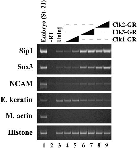 clk1-GR, clk2-GR, and clk3-GR mRNAs (1500 pg and 2000 pg) were injected into the animal hemisphere of 4-cell stage embryos. Ectodermal explants were isolated at the blastula stage, cultured until the neurula stage (stage 21), and subjected to RT-PCR analysis. âEmbryoâ and â-RTâ indicate whole embryos examined in the presence or absence of reverse transcriptase, respectively. |