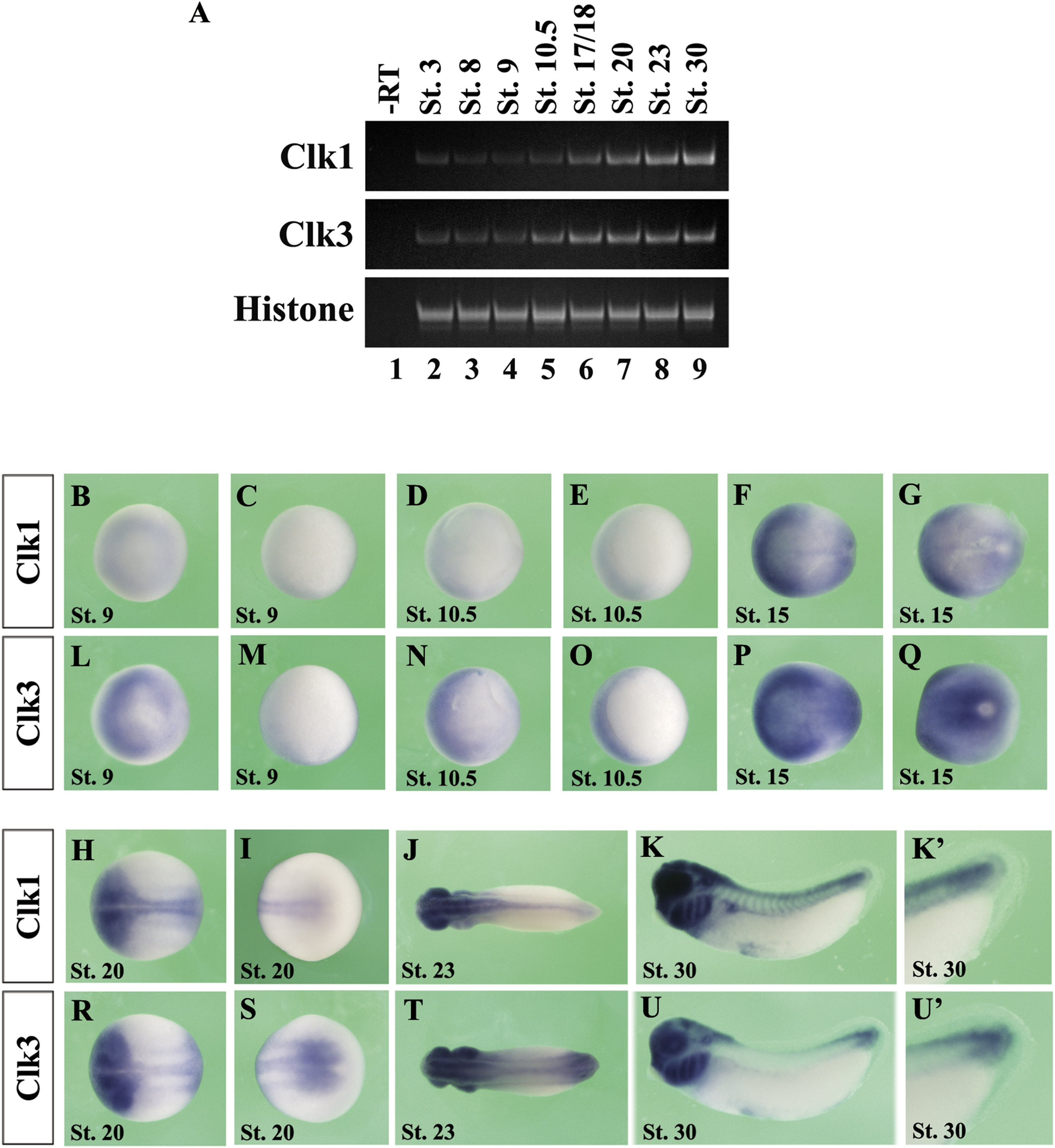 (A) RT-PCR analysis of temporal expression of clk1 and clk3. â-RTâ indicates RNA of whole embryos (stage 20) examined in the absence of reverse transcriptase. (BâUâ²) Spatial expression of clk1 and clk3 analyzed by WISH in developing embryos at stages 9, 10.5, 15, 20, 23, and 30. The expression of clk1 and clk3 are shown in blue/purple. (B, D, L, and N) Animal view. (C, E, M, and O) Vegetal view. (F, H, J, P, R, and T) Dorsal view with the anterior to the left. (G, I, Q, and S) Posterior view with the dorsal to the left. (K and U) Lateral side view with the anterior to the left. (Kâ² and Uâ²) Magnified view of K and U, respectively. (For interpretation of the references to colour in this figure legend, the reader is referred to the Web version of this article.) |