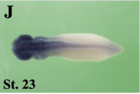clk1 (CDC like kinase 1) gene expression In a Xenopus laevis embryo, NF stage 20, assayed via insitu hybridization, dorsal (H) and posterior-dorsal (I) view, anterior left. |