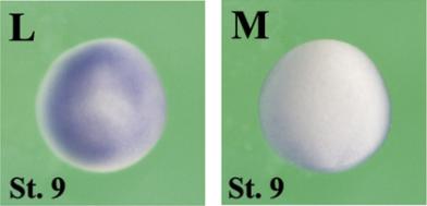 clk3 (CDC like kinase 3) gene expression In a Xenopus laevis embryo, NF stage 9, assayed via in situ hybridization, animal view (L) and vegetal view (M). |