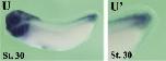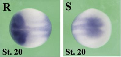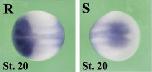 clk3 (CDC like kinase 3) gene expression In a Xenopus laevis embryo, NF stage 20, assayed via in bsitu hybridization, dorsal (R) and posterior-dorsal (S) view, anterior left. |