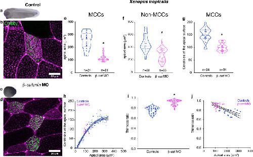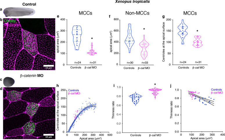 Figure 4—figure supplement 1. Depletion of β-catenin affects apical area and centriole number in MCCs Stage 28 embryos of (a) controls and (c) β-catenin morphants.Images are to scale. Mature epidermal MCCs marked with chibby-GFP (centrioles, green), and phalloidin (F-actin, magenta) in (b) control and (d) β-catenin morphant embryos at stage 28. Quantitation of (e) apical area of MCCs, (f) apical area of non-MCCs, and (g) centriole number in control and β-catenin morphant embryos at stage 28. (h) Regression plot showing the positive correlation between apical area and centriole number. (i) TR in the β-catenin morphants is significantly higher than controls, (j) A regression plot showing the negative correlation between the TR and apical area between controls and β-catenin morphants. * indicates statistical significance at p < 0.05. The statistical comparison between the treatments (e, g, i) is done using an unpaired t test. The statistical comparison between the treatments in (f) is done using Mann-Whitney test. n = number of cells collected from 10 to 15 embryos. The data is uploaded as source data 4. |